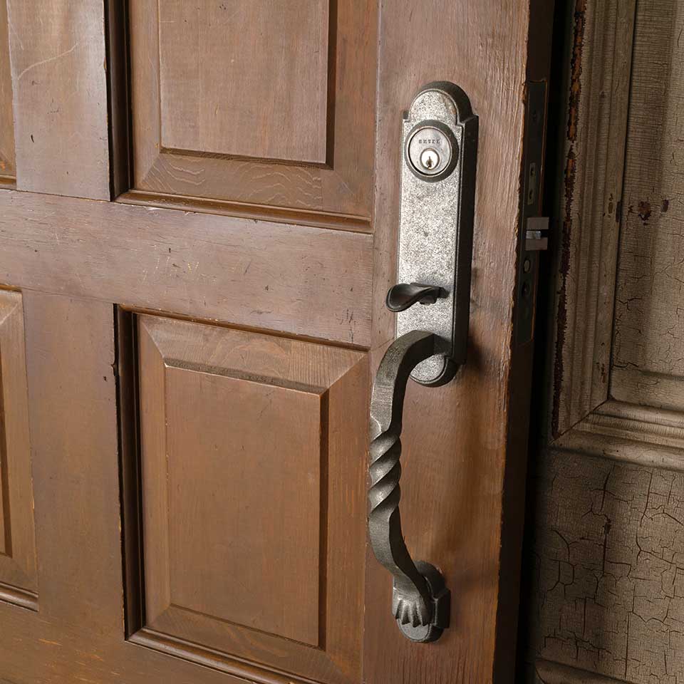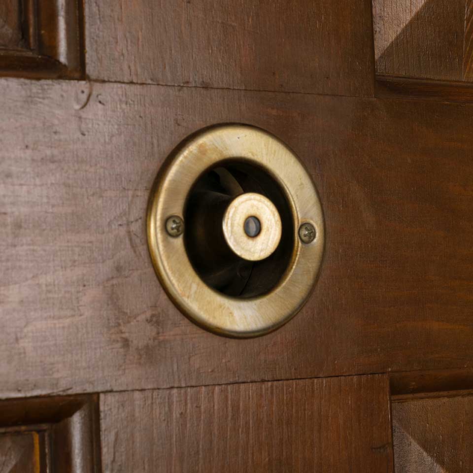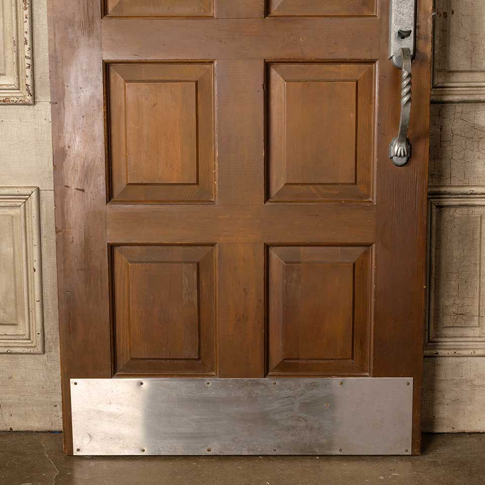 Architectural salvage vintage mid-century modern wood entry door with spyglass peep hole and hardware measuring approx. 35 7/8" wide x 78 5/8" tall x 1 3/4" thick. See photos to evaluate condition.