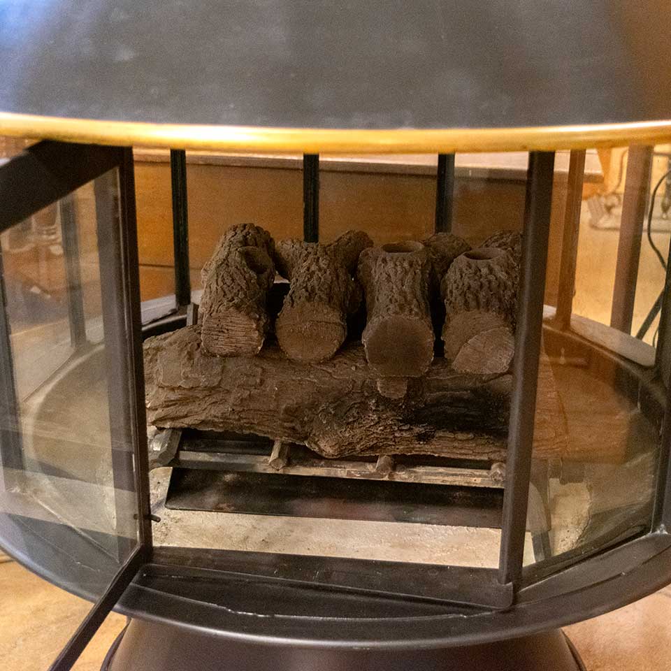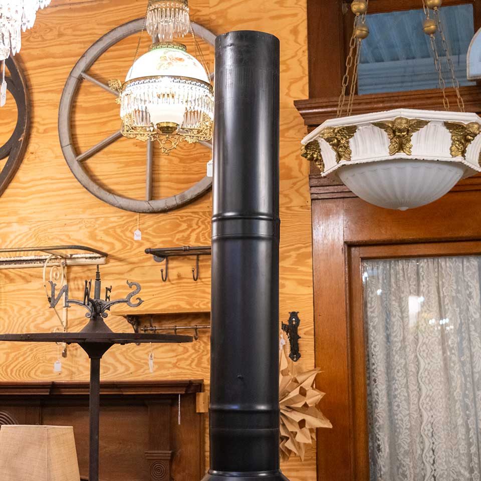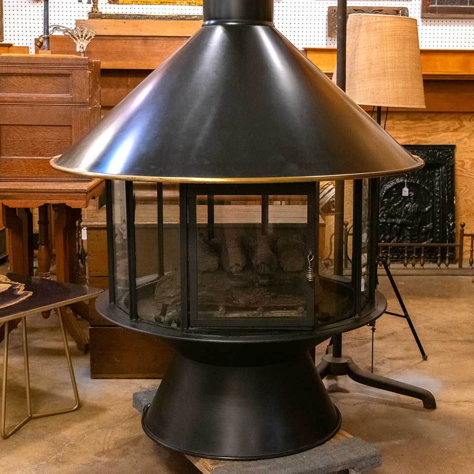 Architectural salvage vintage mid-century modern Majestic Carousel Fireplace measuring approx. 41" in diameter x 45" tall with a 50 1/2" tall flue pipe. See photos to evaluate condition.