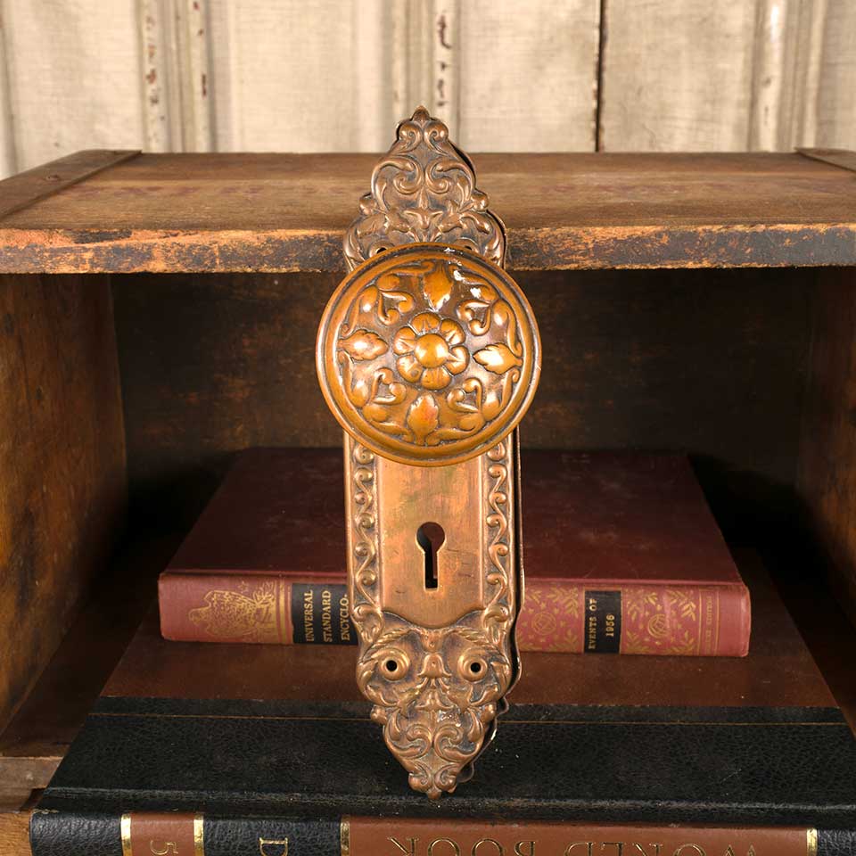 Architectural salvage antique brass Reading Hardware Company Mura pattern (circa 1897) door hardware set including two doorknobs (2 1/4" diameter), two backplates (2" wide x 8" tall), and a tapped spindle with set screws. See photos to evaluate condition. Priced at $250 for the set.