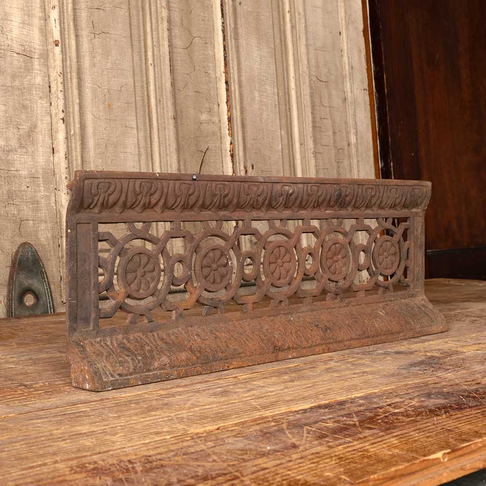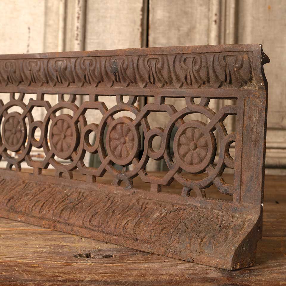 Architectural salvage antique ornate cast iron fireplace ember screen measuring approx. 20" wide x 7" tall x 2 1/4" front to back. See photos to evaluate condition.