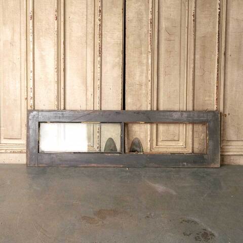 Architectural salvage antique divided two lite wood transom window measuring approx. 40" wide x 11 1/2" tall x 1 1/4" thick. One of the glass panes is missing. See photos to evaluate condition.