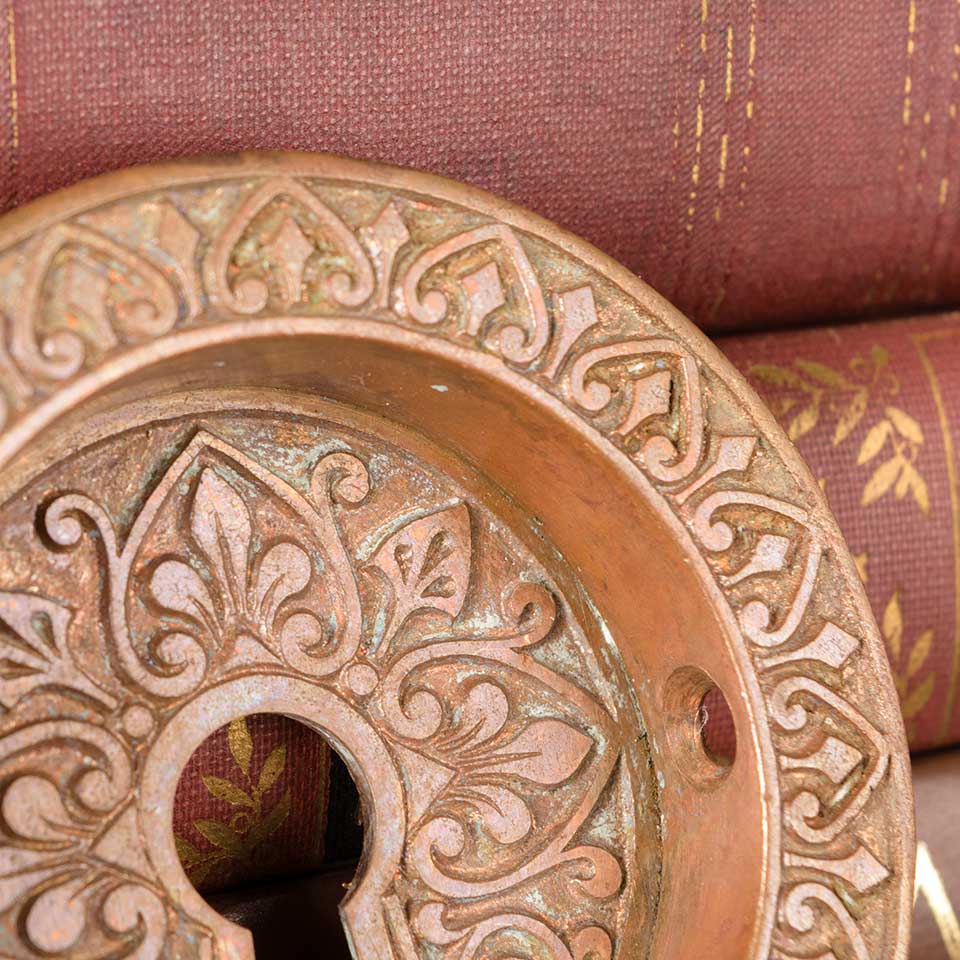 Set of two architectural salvage antique Russell & Erwin (c.1887) ornate Victorian round cast bronze pocket door hardware handle pulls with keyholes each measuring approx. 2 5/8" in diameter with a 1 15/16" diameter recessed area. See photos to evaluate condition. Priced at $150 for the two piece set.