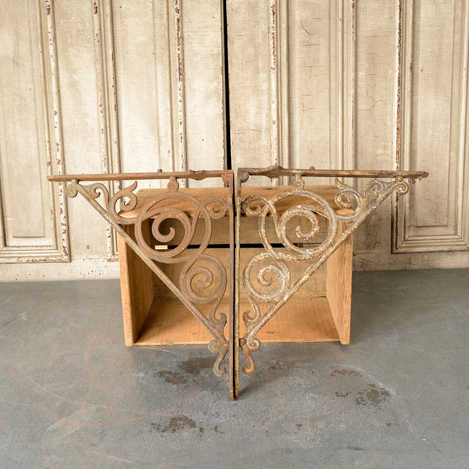 Set of architectural salvage antique cast iron bathroom marble top sink brackets each measuring approx. 2 1/2" wide (widest point) x 17 7/8" tall x 15 3/4" front to back. See photos to evaluate condition. Priced at $325 for the two piece set.