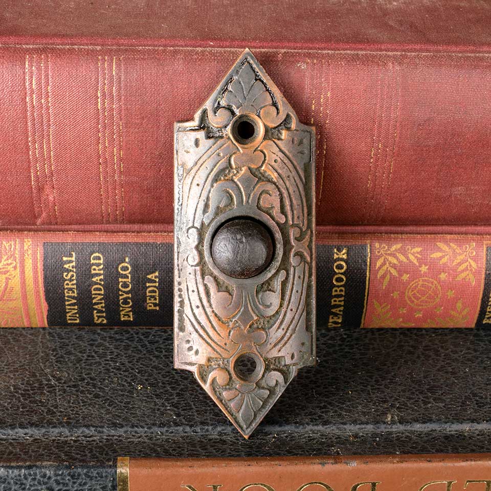 Architectural salvage antique Victorian cast brass push button ring doorbell hardware measuring approx. 1 1/4" wide x 3 3/8" with a 7/8" front to back. See photos to evaluate condition.