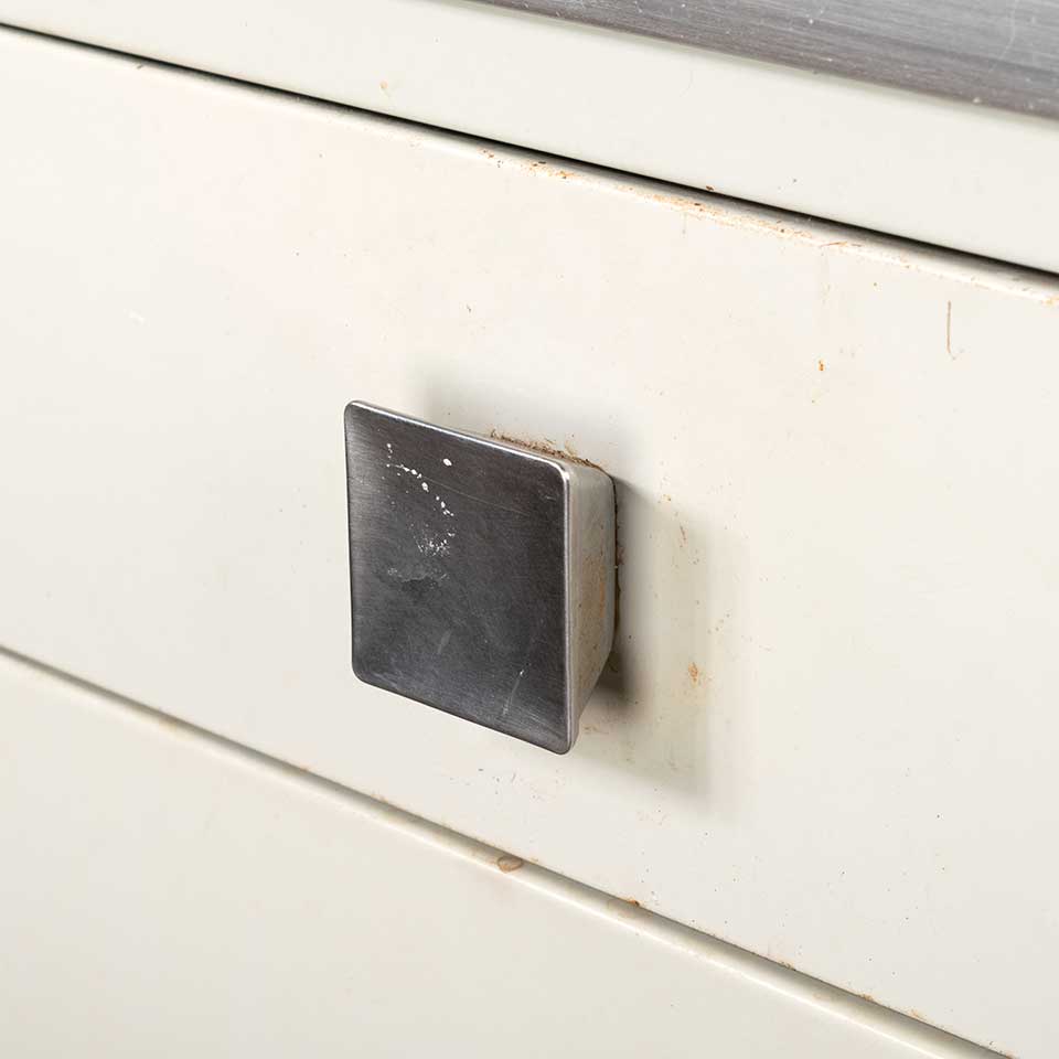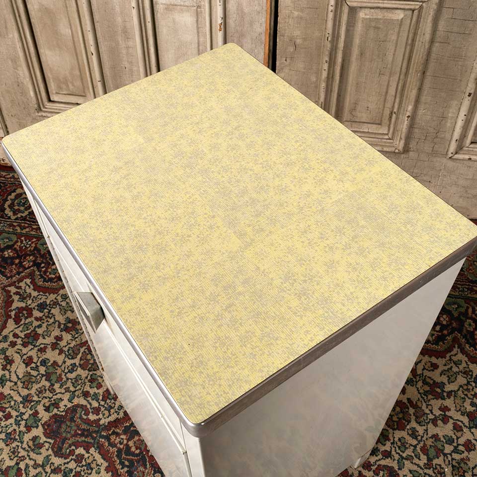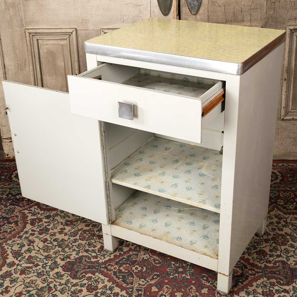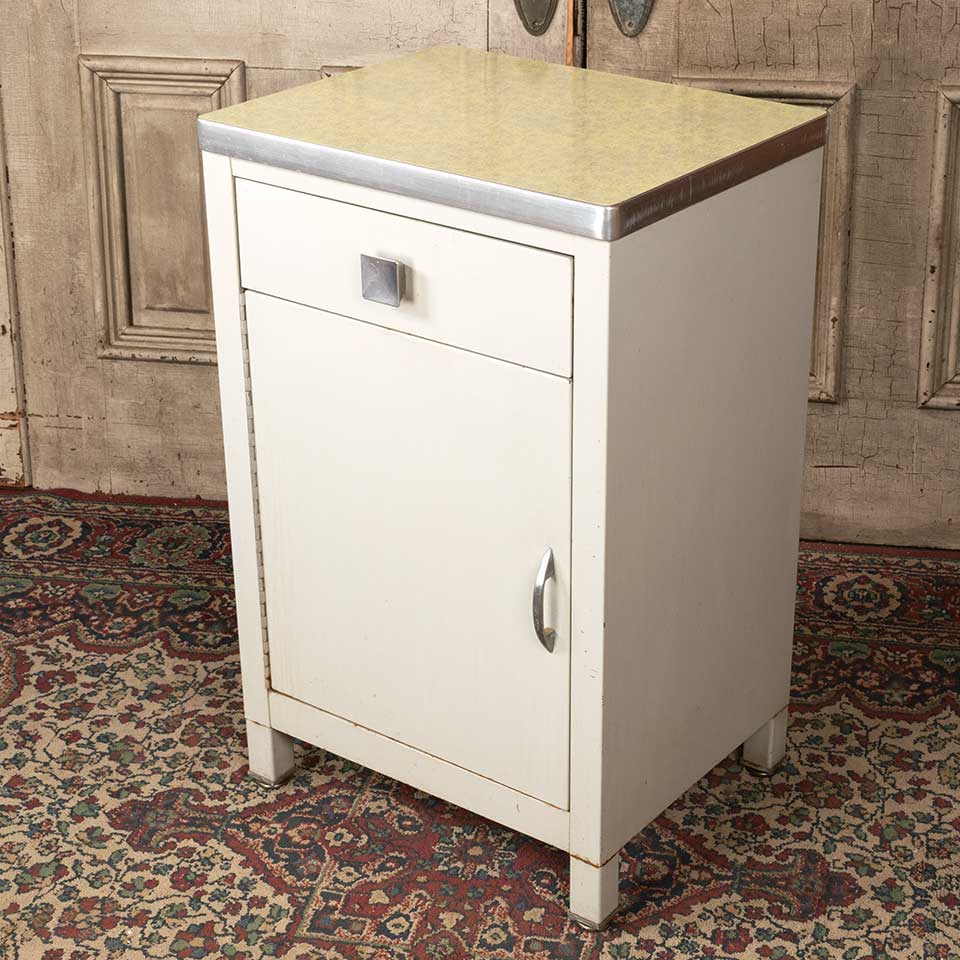 Architectural salvage vintage SIMMONS Furniture metal cabinet measuring approx. 20" wide x 31 1/4" tall x 17 5/8" front to back. See photos to evaluate condition.