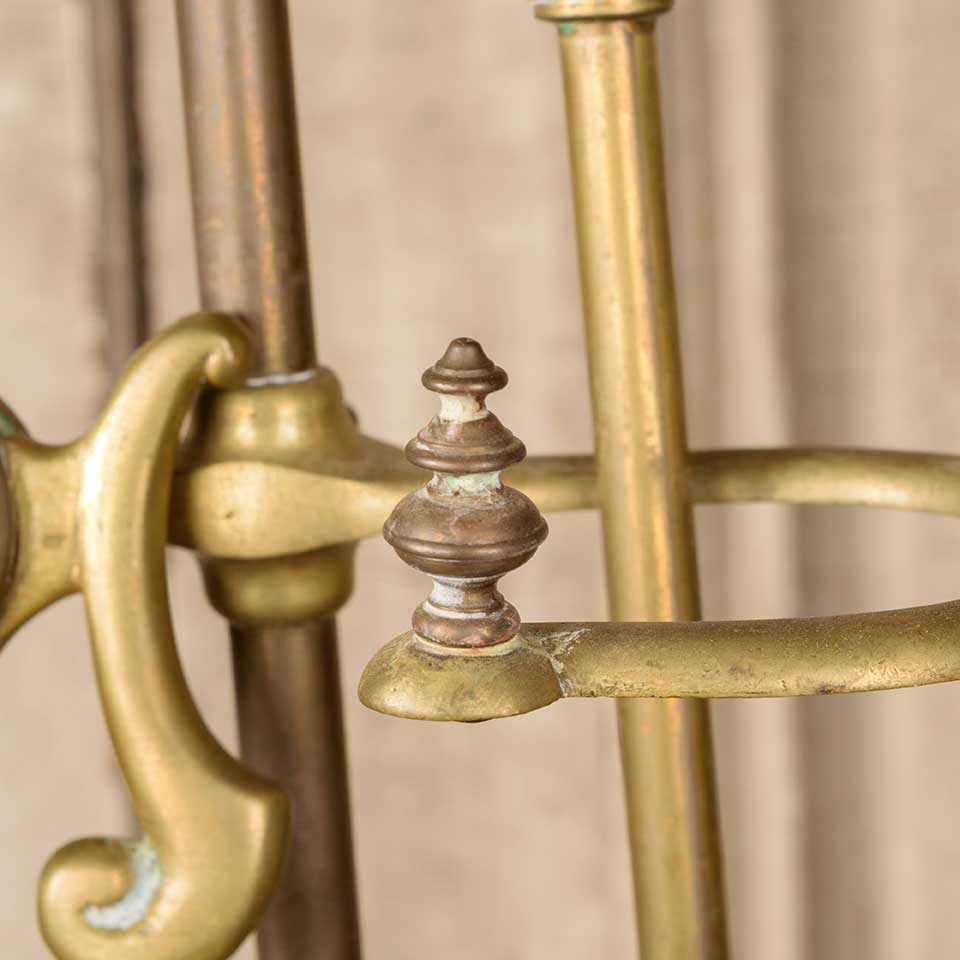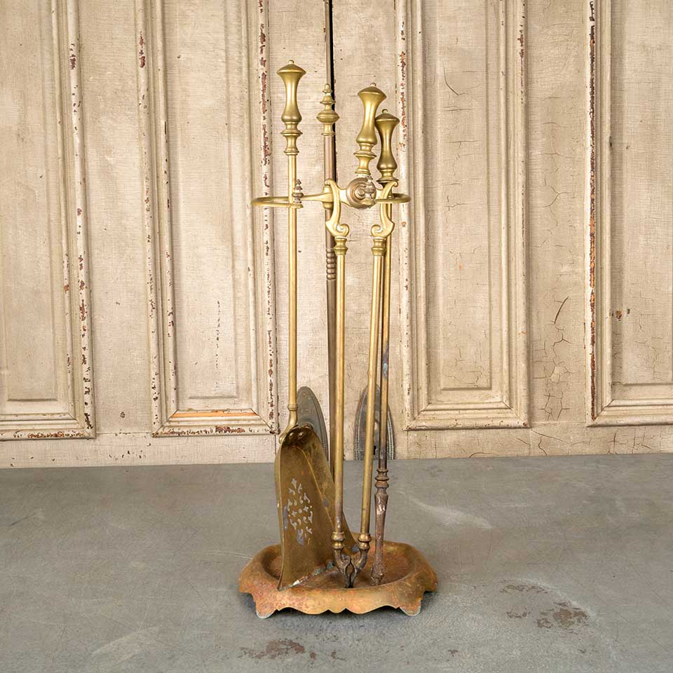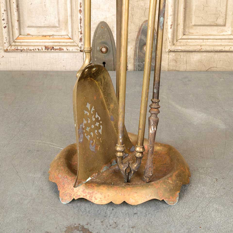Architectural salvage antique three piece brass fireplace tool set with stand measuring approx. 11" wide x 27" tall x 10" front to back. The set includes an ash shovel, tongs, log poker, and stand. Priced at $195 for the set.