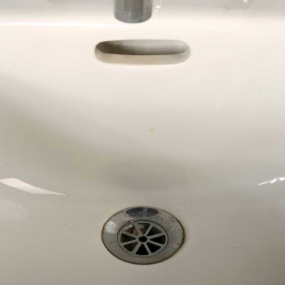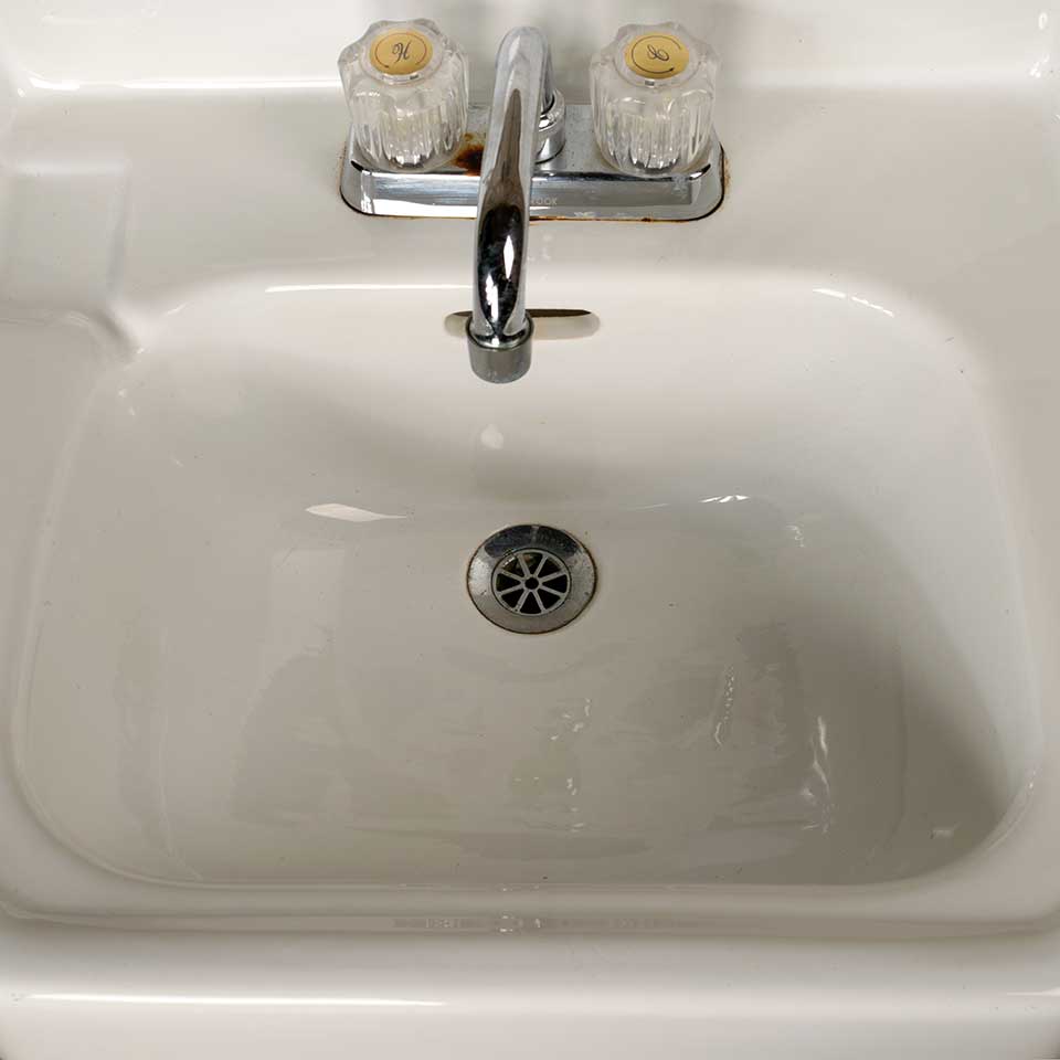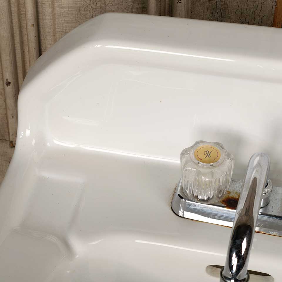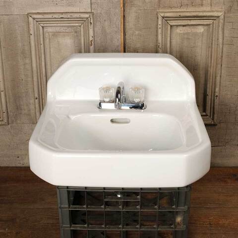 Architectural salvage antique Kohler porcelain wall mount bathroom sink with clipped corner backsplash measuring approx. 20 3/4" wide x 13 1/2" tall x 18 1/2" front to back. The fixtures are included but not guaranteed to be in working order. A pair of wall mounting brackets are included. See photos to evaluate condition.