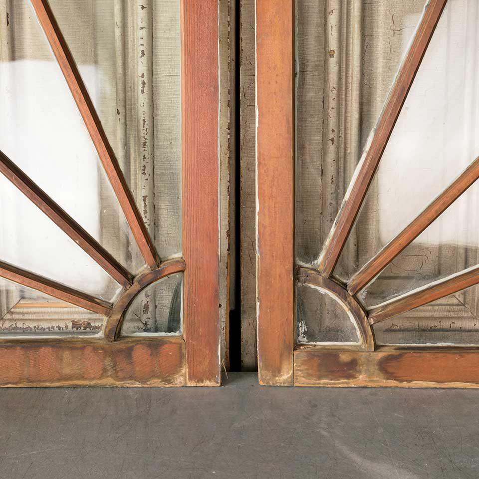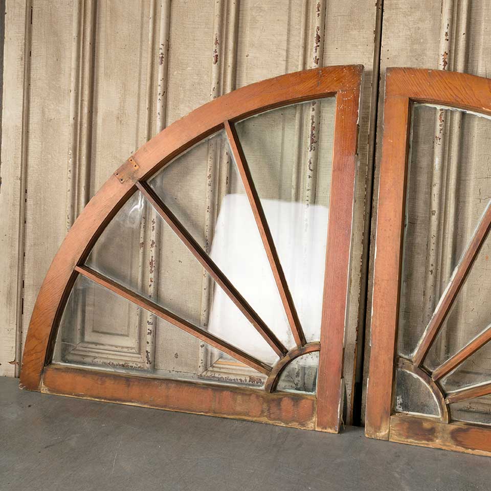Pair of architectural salvage antique quarter circle / round divided lite wood window sashes each measuring approx. 29 3/4" wide x 29 3/4" tall x 1 1/4" front to back. There's one cracked pane of glass. See photos to evaluate condition. Priced at $550 for the pair.