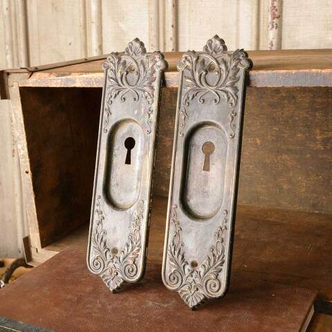 Set of two architectural salvage antique metal Corbin Loraine pattern (c. 1905) pocket door hardware handle pulls with keyholes each measuring approx. 2 1/2" wide x 8 1/2" tall x 1/8" thick with a recessed area of 1 1/2" wide x 3" tall. See photos to evaluate condition. Priced at $150 for the two piece set.