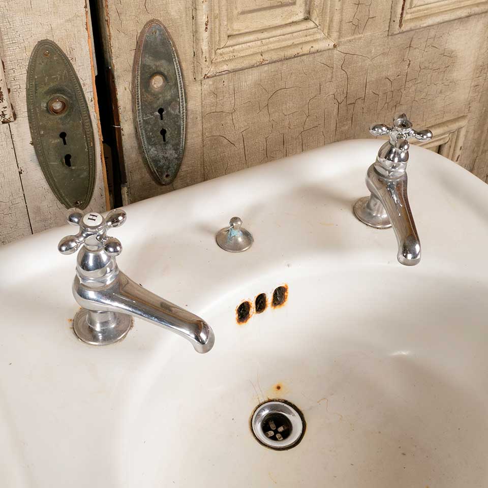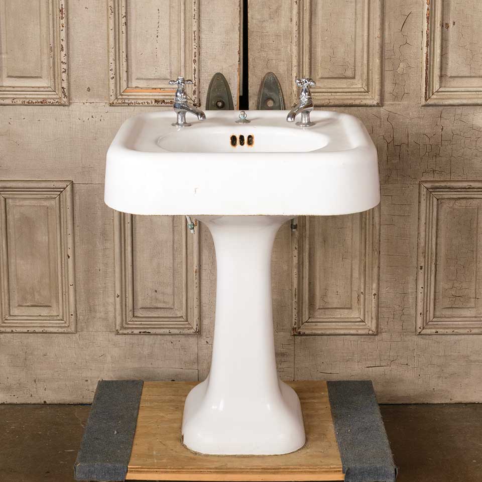 Architectural salvage antique cast iron porcelain enameled bathroom pedestal sink measuring approx. 23 1/2" wide x 30 1/8" tall x 20 1/4" front to back. See photos to evaluate condition.