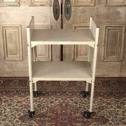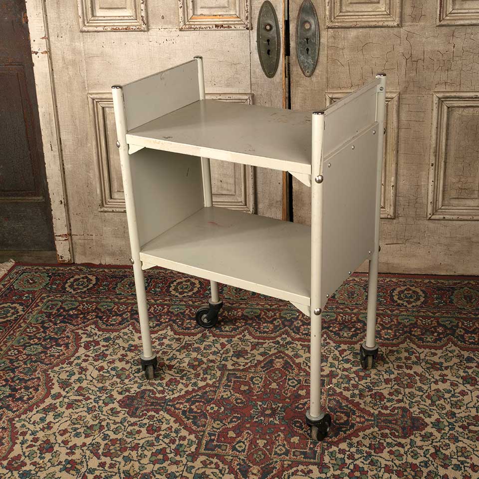 Architectural salvage vintage rolling metal library book cart measuring approx. 22 1/8" wide x 34 7/8" tall x 14 5/8" front to back. See photos to evaluate condition.