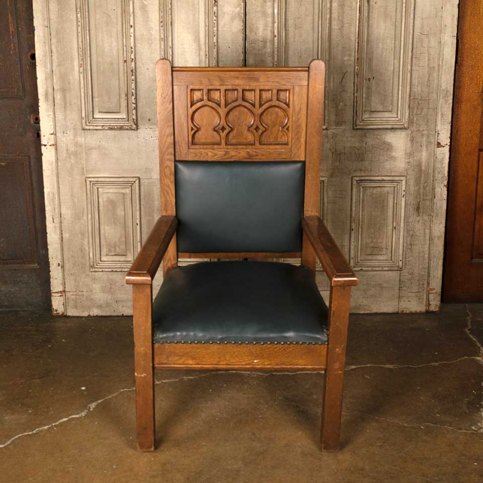 Architectural salvage antique carved oak Gothic throne arm chair with upholstered seat and back measuring approx. 27 1/4" wide x 48 3/8" tall x 25" front to back. See photos to evaluate condition.