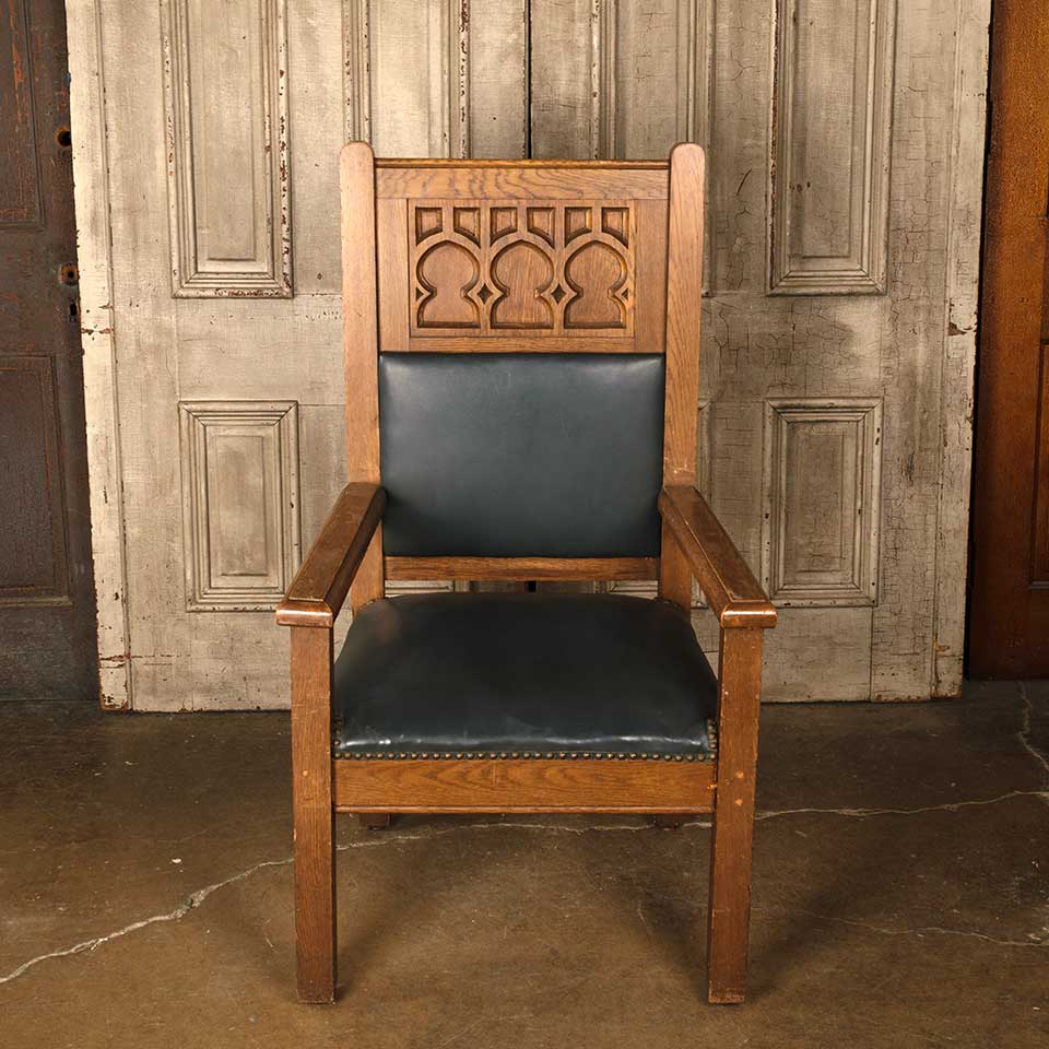 Architectural salvage antique carved oak Gothic throne arm chair with upholstered seat and back measuring approx. 27 1/4" wide x 48 3/8" tall x 25" front to back. See photos to evaluate condition.