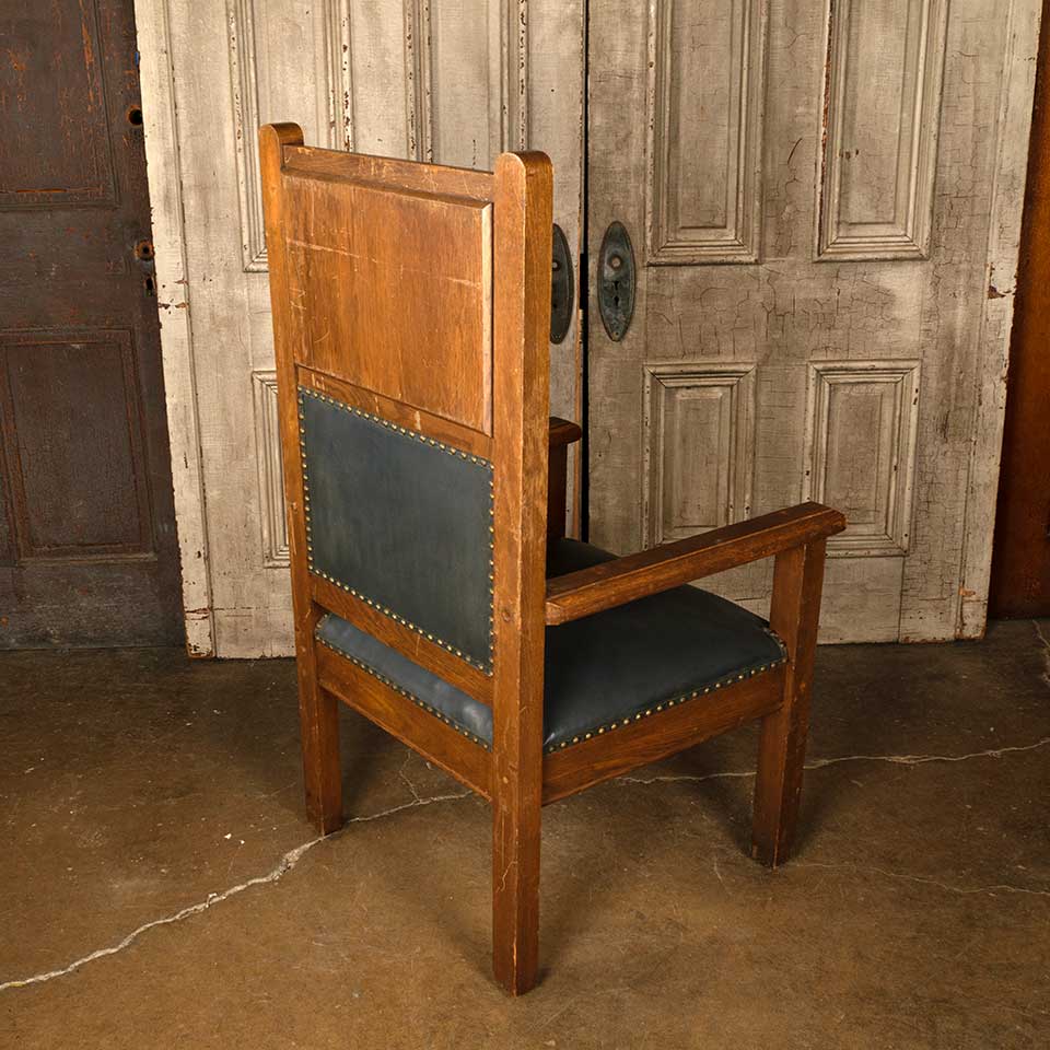 Architectural salvage antique carved oak Gothic throne arm chair with upholstered seat and back measuring approx. 27 1/4" wide x 48 3/8" tall x 25" front to back. See photos to evaluate condition.