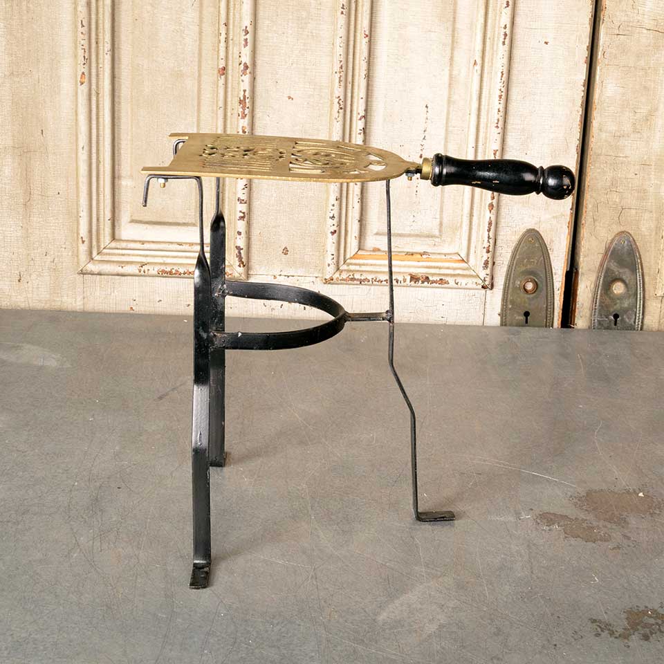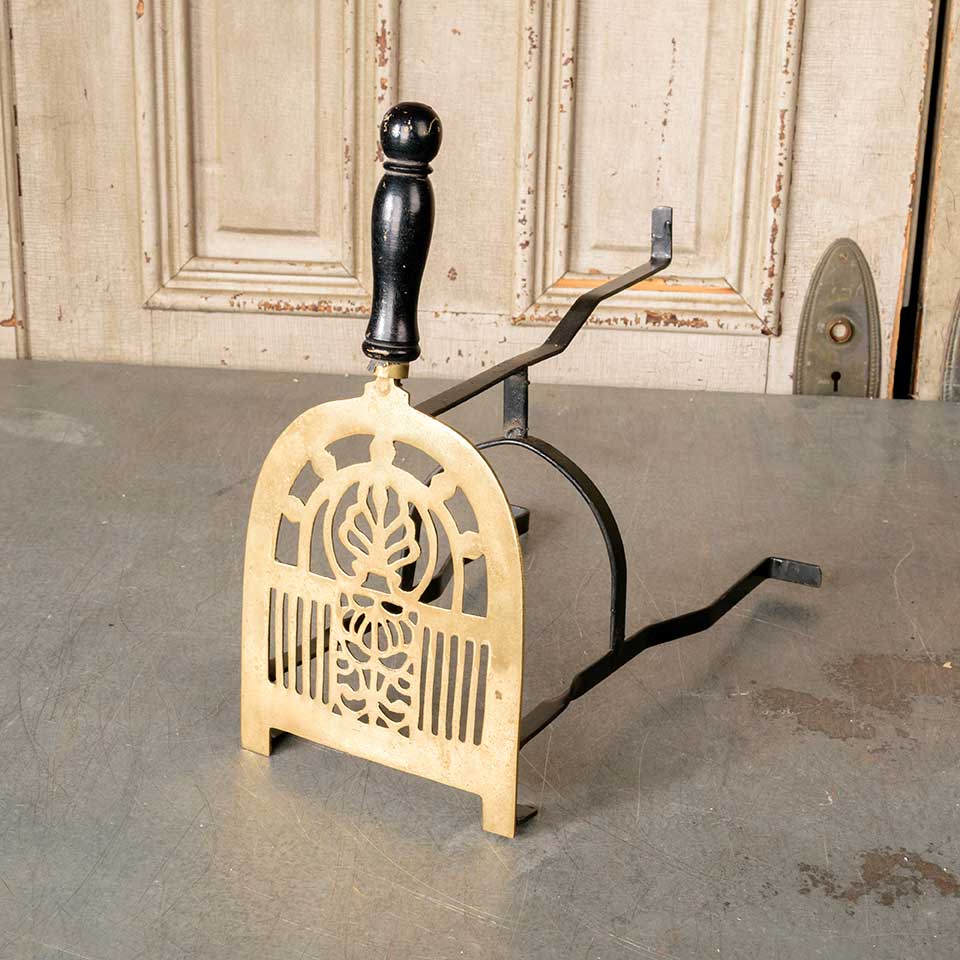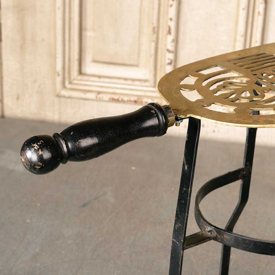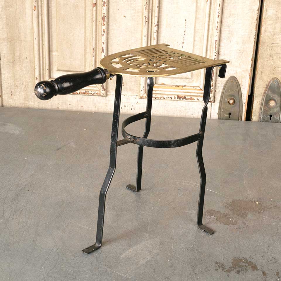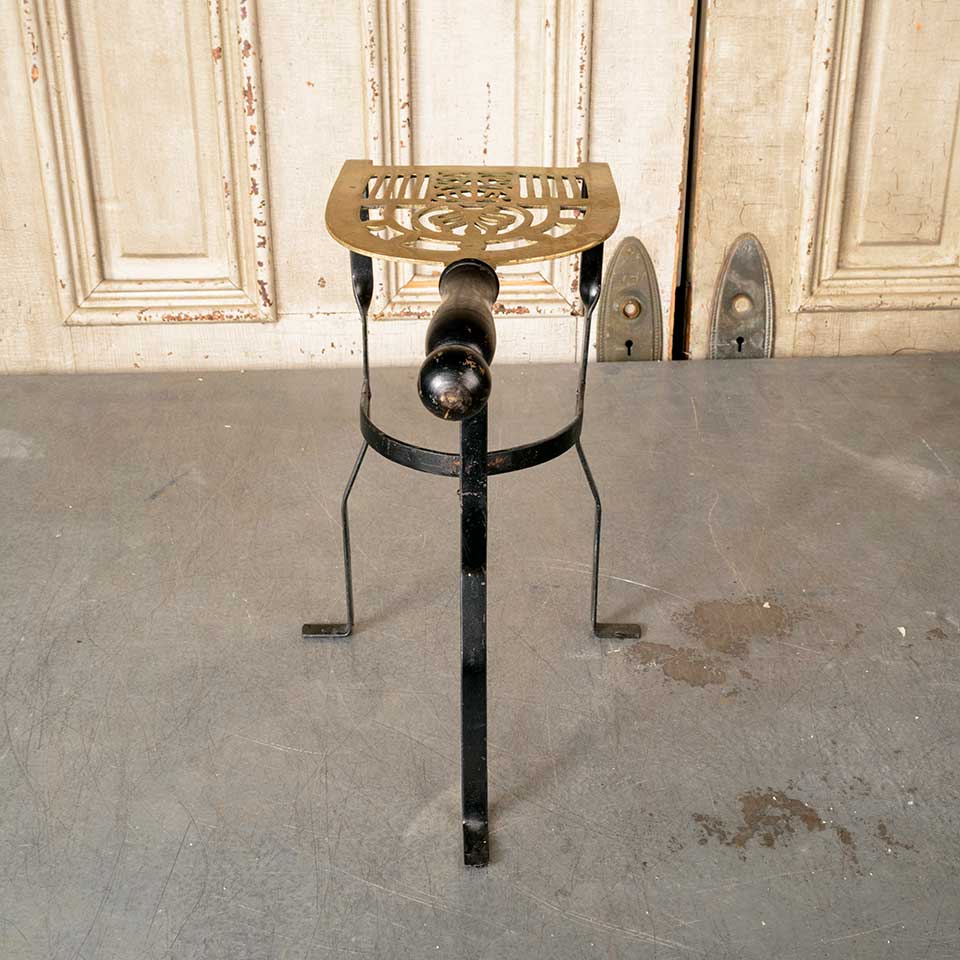 Architectural salvage antique brass and wrought iron fireplace hearth trivet stand measuring approx. 10" wide x 14 1/4" tall x 14 1/2" front to back. See photos to evaluate condition.