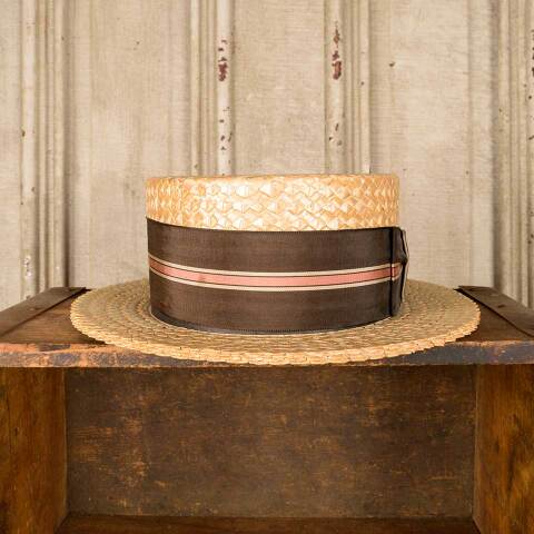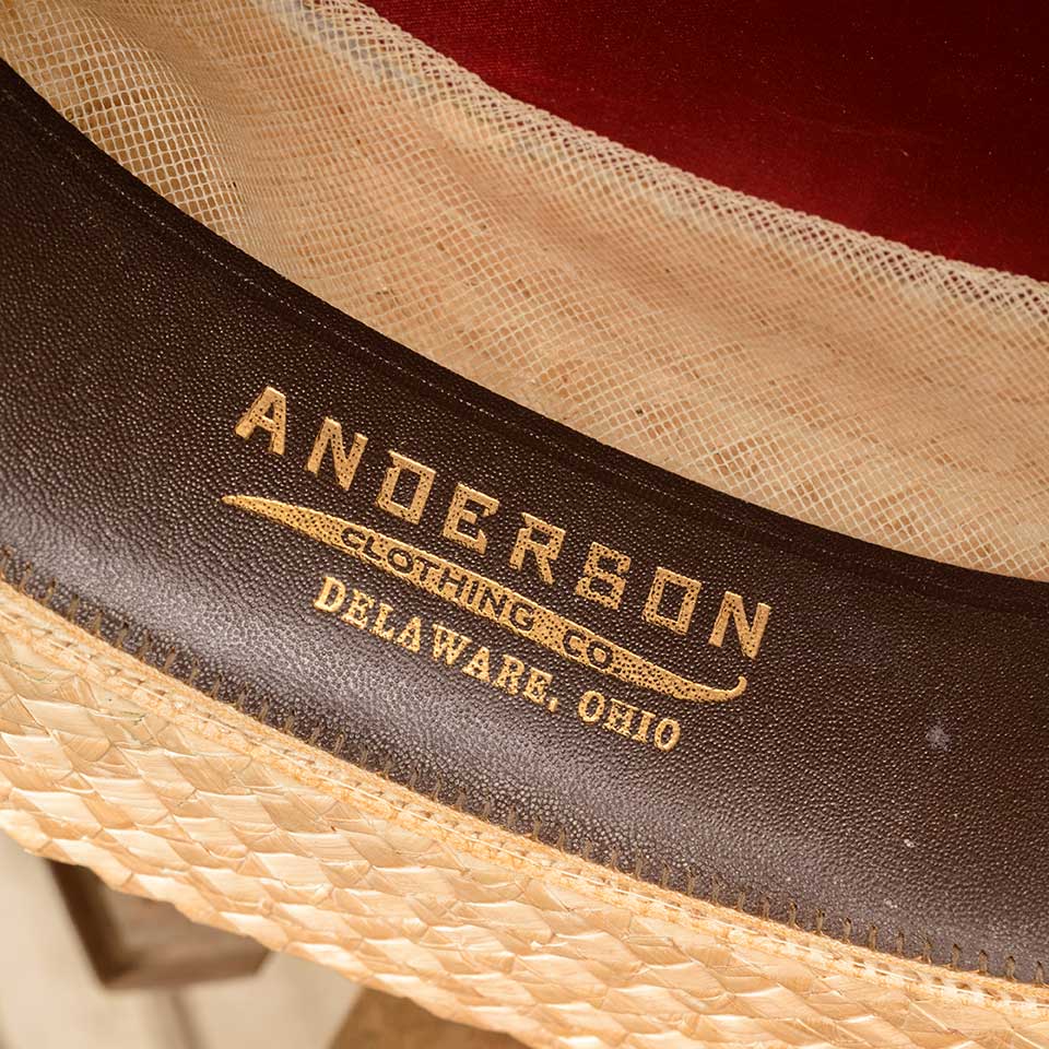 Vintage 1940's HOPKINS BALTIMORE straw hat with striped ribbon measuring approx. 10 1/2" wide x 3 1/2" tall x 12 1/4" front to back. ANDERSON CLOTHING CO. DELAWARE, OHIO is printed on the inside of the hat. There is a small hole on top of hat, see photos to evaluate.