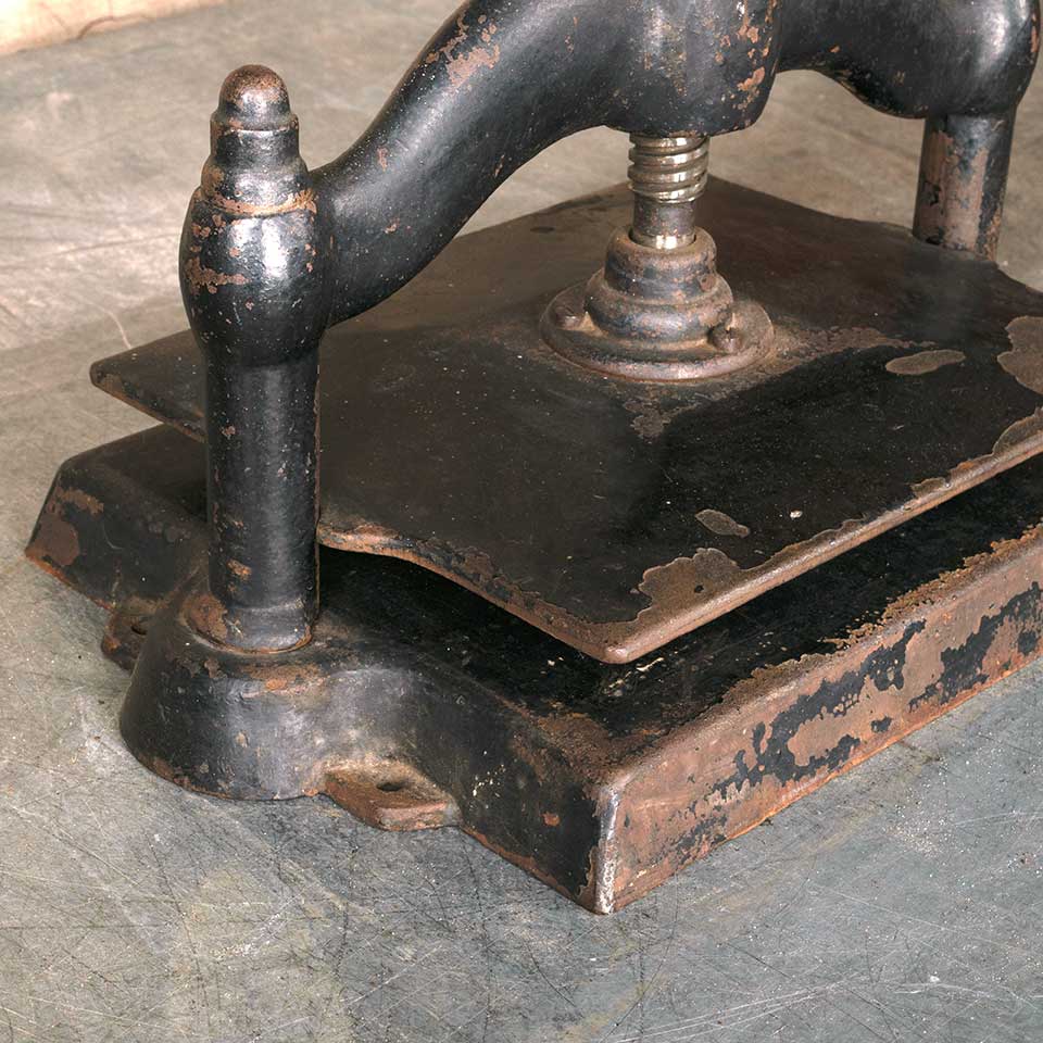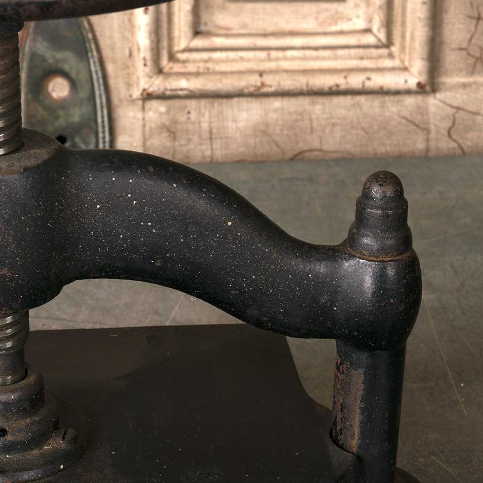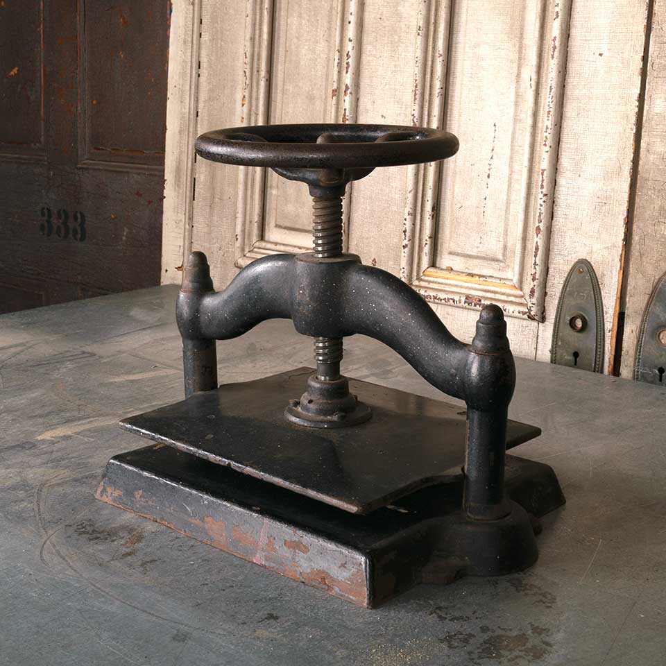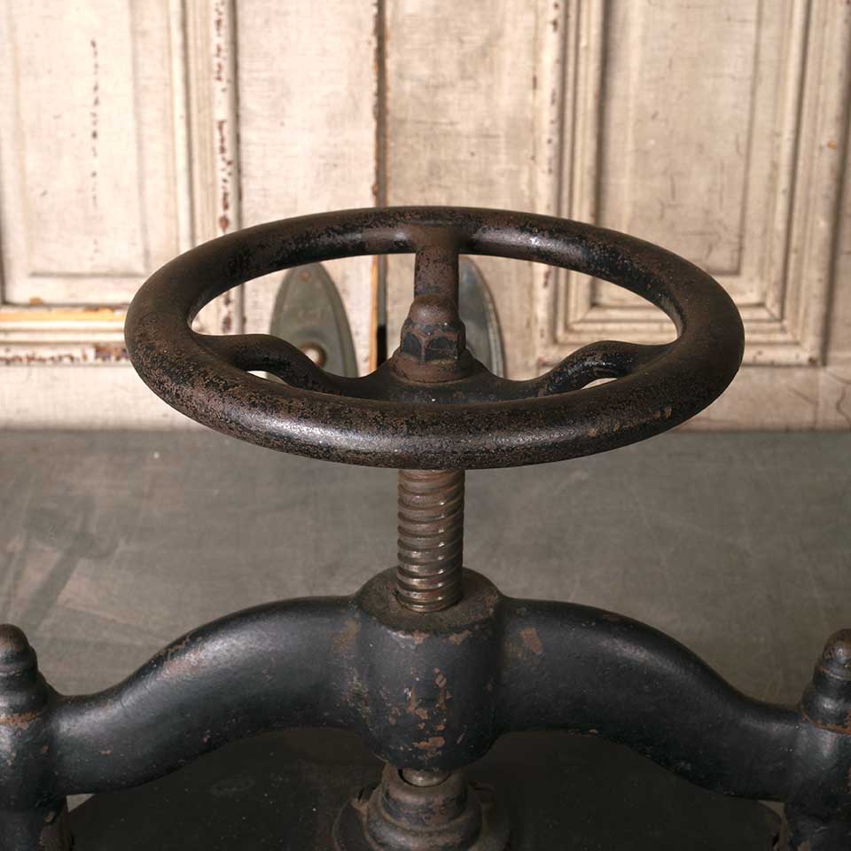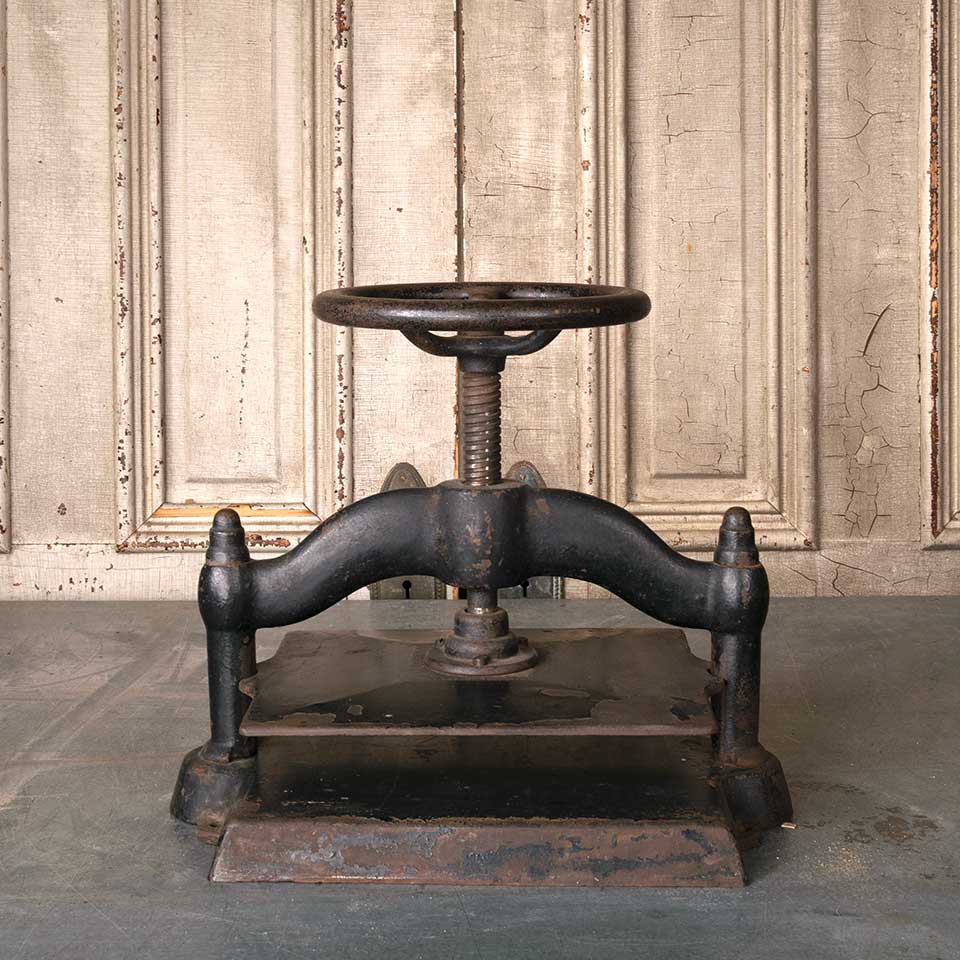 Architectural salvage cast iron manual turn book press measuring approx. 17 1/2" wide x 12 1/4" tall (all the way down) x 11 1/4" front to back. See photos to evaluate condition.