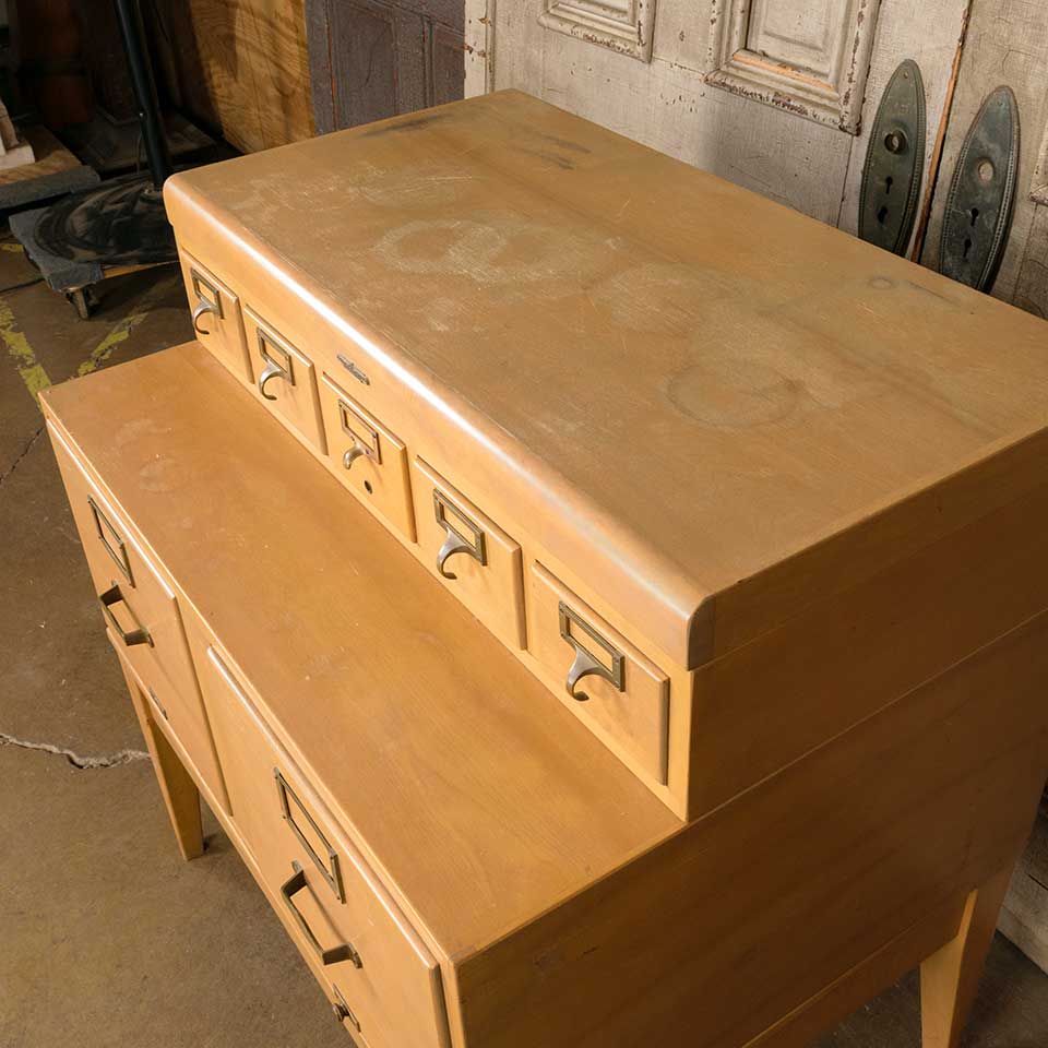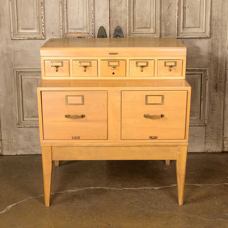 Architectural salvage vintage maple four piece card catalog and file drawer unit measuring approx. 33" wide x 36 1/4" tall x 24" front to back. One of the card catalog drawers is not original. See photos to evaluate condition.