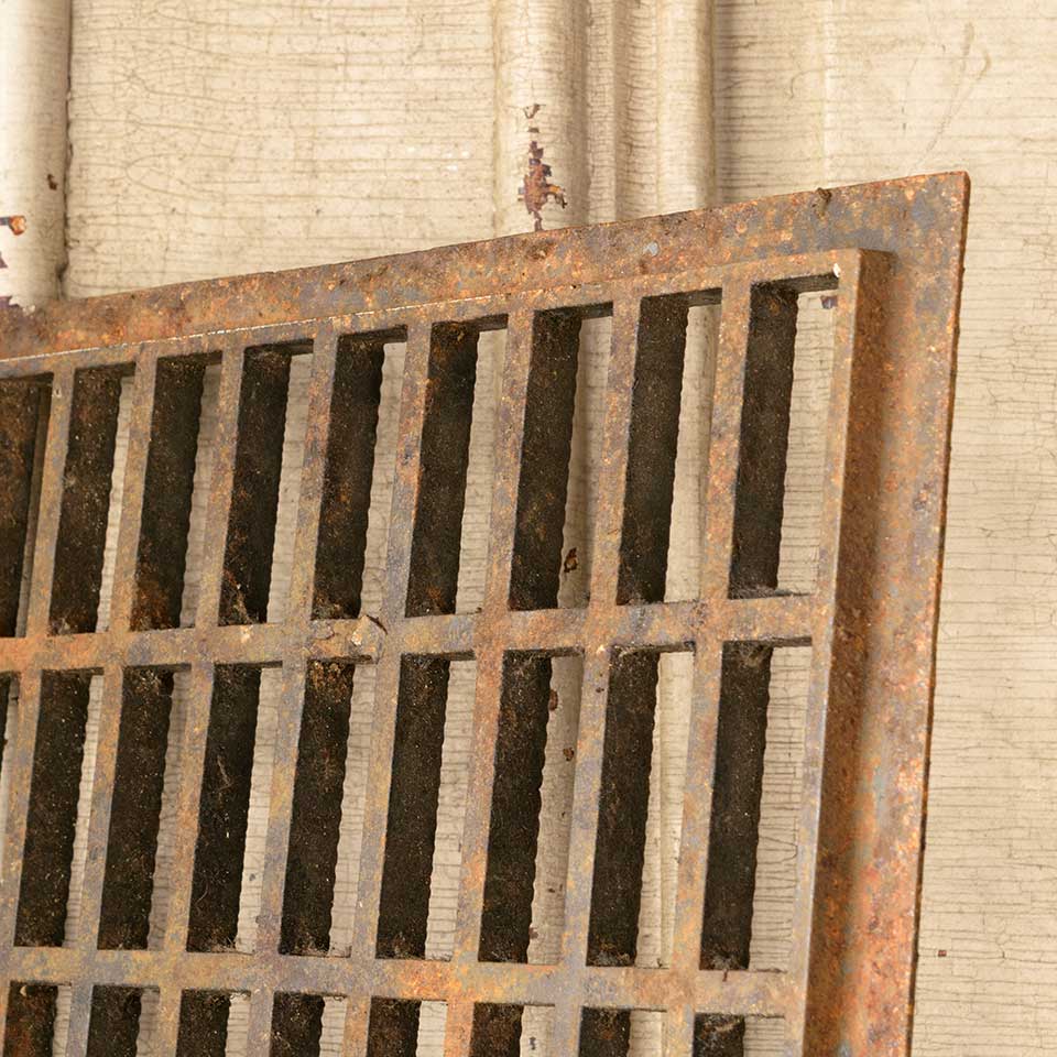 Architectural salvage antique cast iron cold air return floor grate vent cover measuring approx. 11 7/8" x 29 7/8" (insert dimensions) and 13" x 31" (overall dimensions). See photos to evaluate condition.