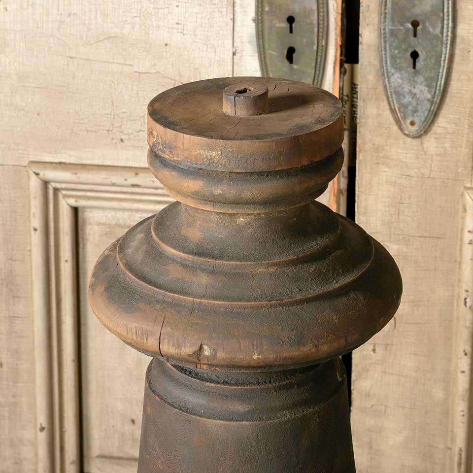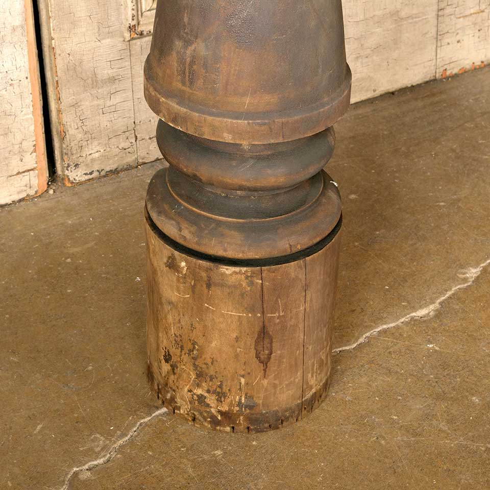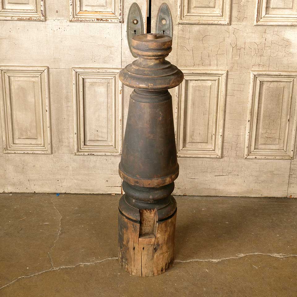 Architectural salvage antique large turned wood newel post measuring approx. 37 1/2" tall with a 5 1/2" diameter top and a 9 5/8" diameter base. See photos to evaluate condition.