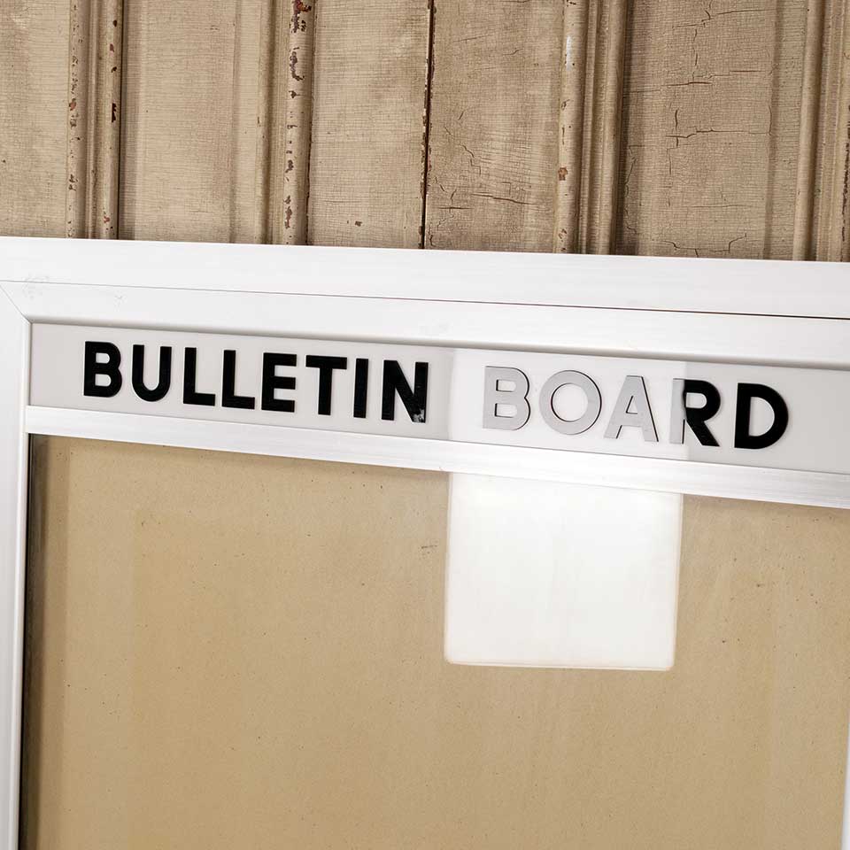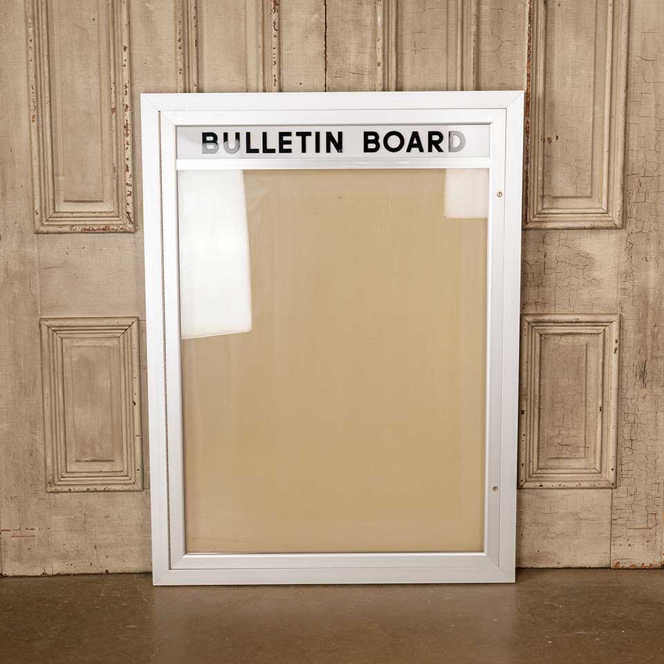 Architectural salvage metal bulletin / notice board wall cabinet with hinged glass door measuring approx. 36" wide x 48" tall x 2" front to back. There is no key for the locks, but the door opens. See photos to evaluate condition.
