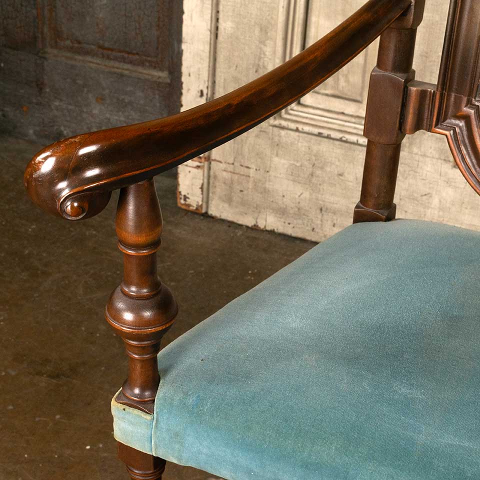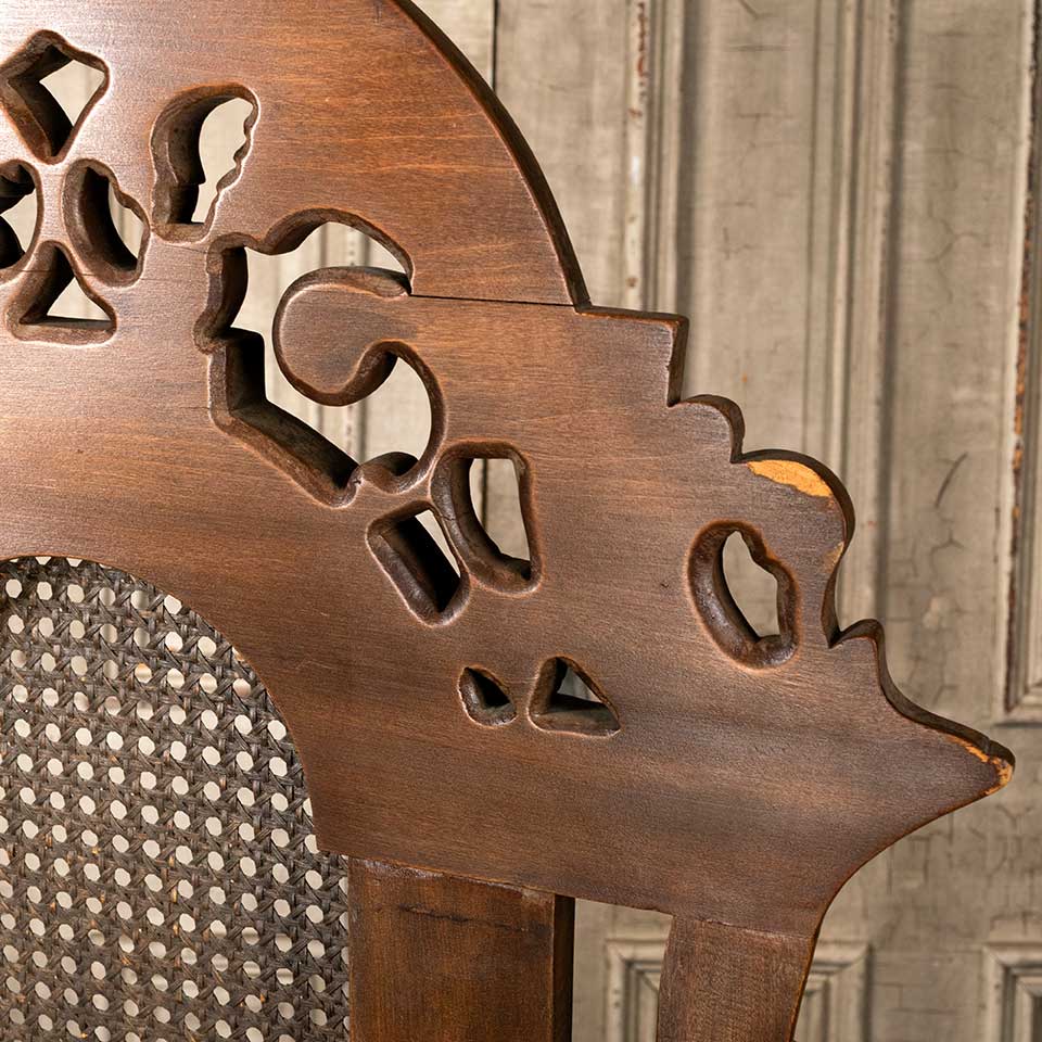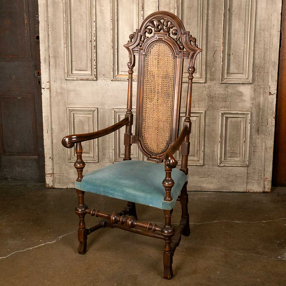 Antique carved wood high back armchair measuring approx. 27 1/2" wide x 55 1/2" tall x 24" front to back. See photos to evaluate condition.
