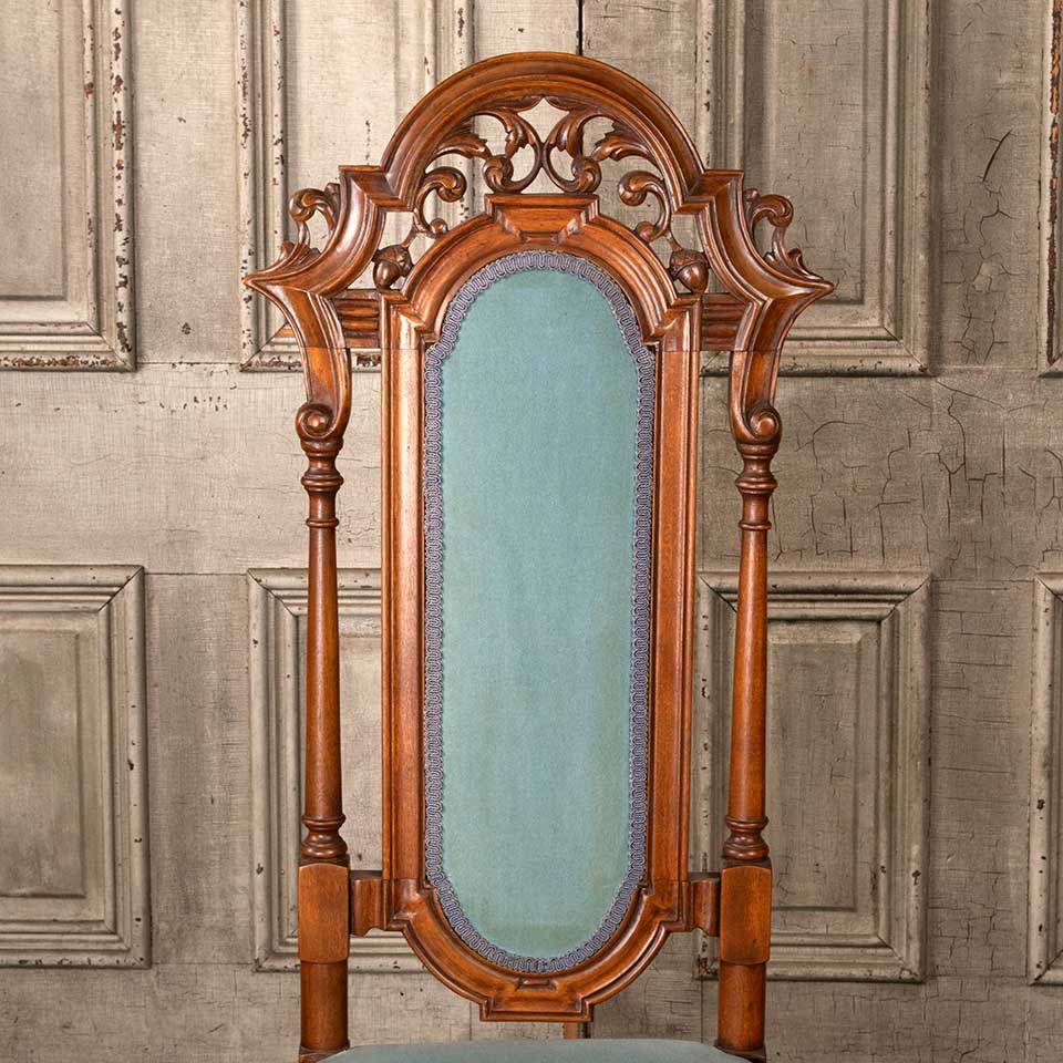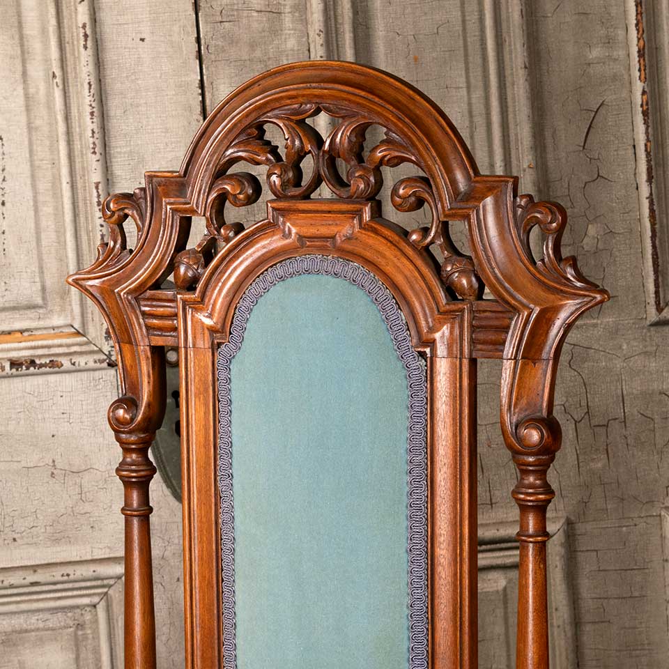 Antique carved wood parlor chair measuring approx. 19 1/2" wide x 50" tall x 21" front to back. See photos to evaluate condition.