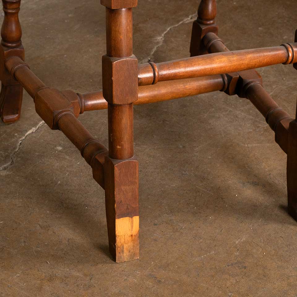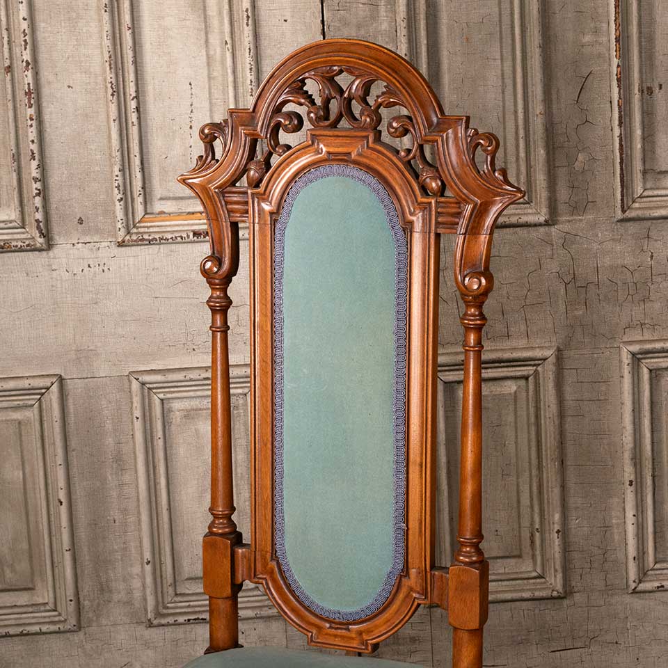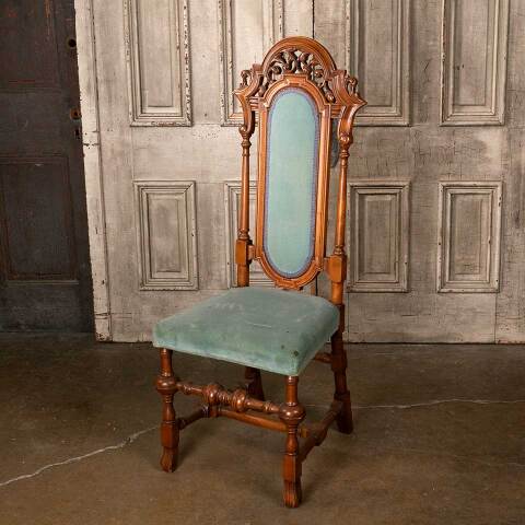 Antique carved wood parlor chair measuring approx. 19 1/2" wide x 50" tall x 21" front to back. There's staining on the fabric of the seat and wood loss on one back leg. See photos to evaluate condition.