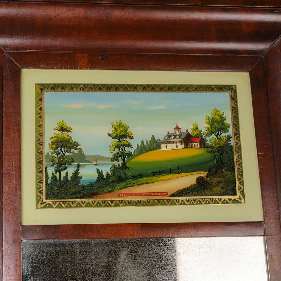 Antique wood framed eglomise mirror with painted scene of George Washington's Mount Vernon measuring approx. 21 3/16" wide x 40 3/4" x 1 13/16" front to back. There's some veneer loss at the top right corner. See photos to evaluate condition.