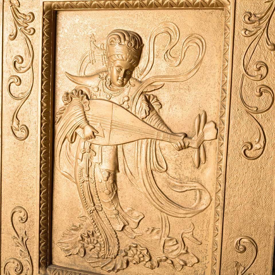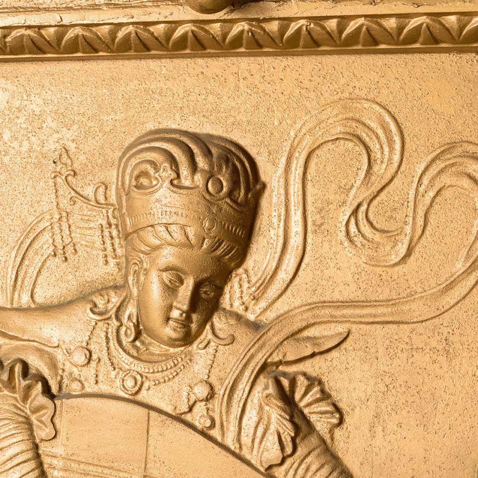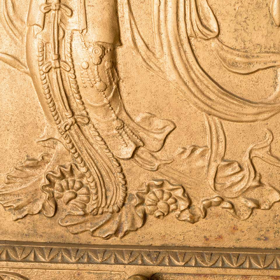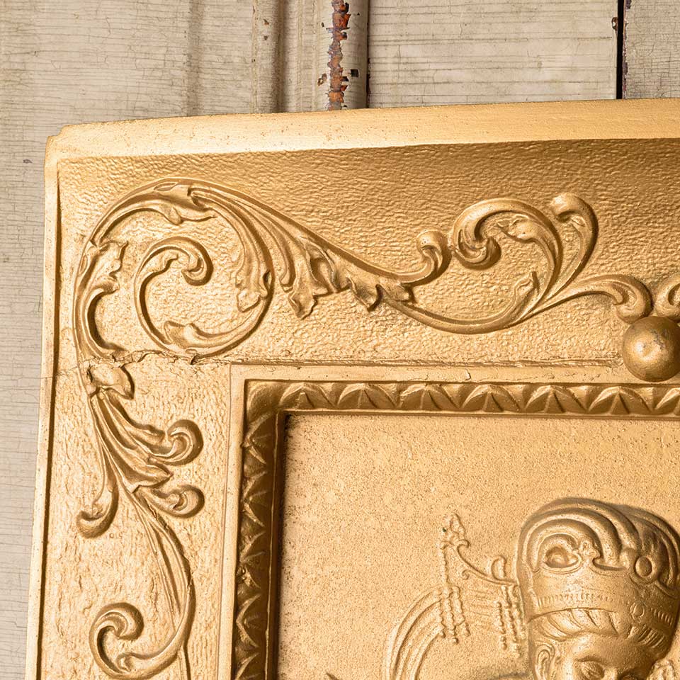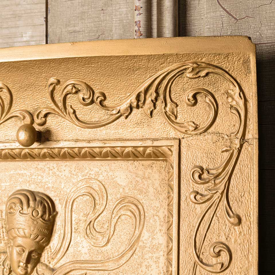 Architectural salvage antique ornate cast iron fireplace summer front cover with figural motif in relief measuring approx. 20 1/2" wide (at top) x 26 1/2" tall x 2 5/8" front to back. At some point in its history the top portion of the piece has been repaired. See photos to evaluate condition.