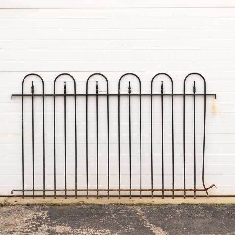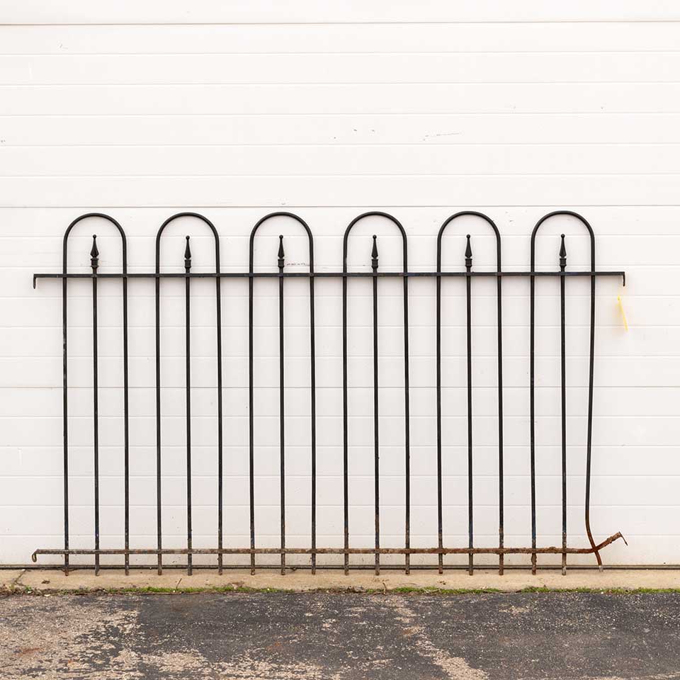 Architectural salvage antique wrought iron garden fence section measuring approx. 48" tall x 1" front to back with lengths as follows: 1 @ 51 1/4" ($219.86); 2 @ 77 3/4" ($333.55/each); 1 @ 78" ($334.62). Color and condition may vary.