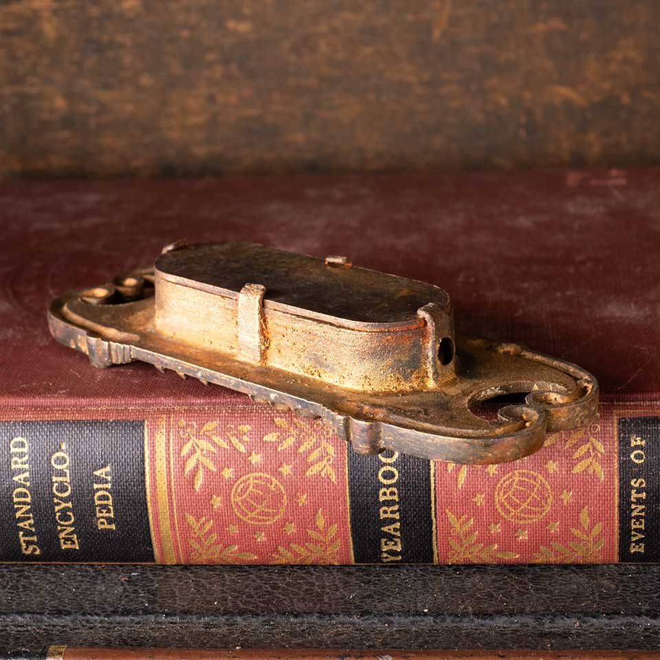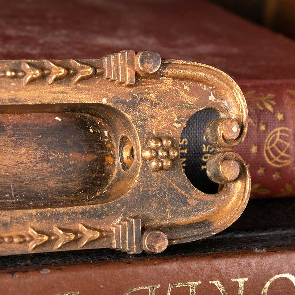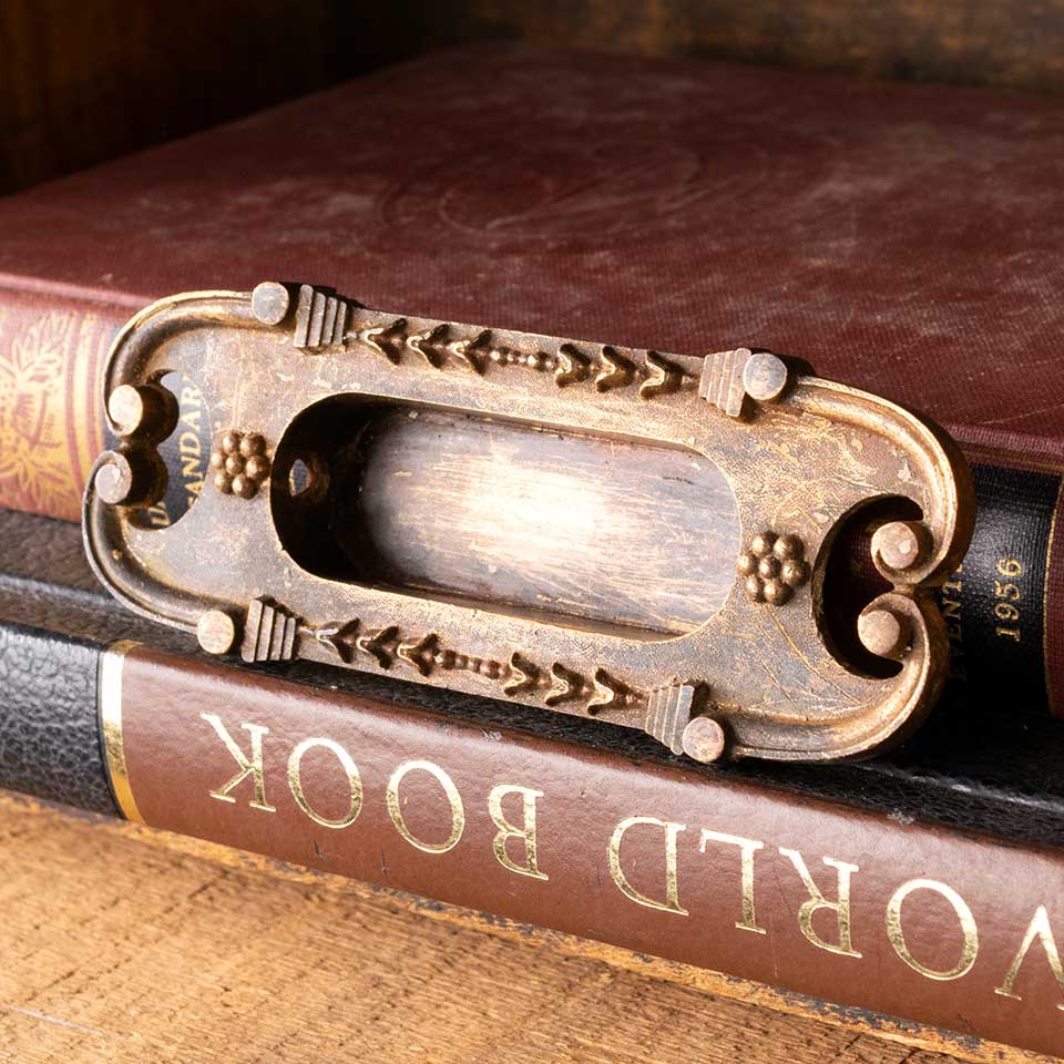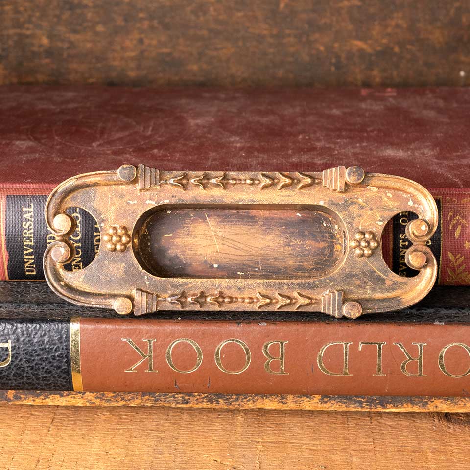 Architectural salvage antique Corbin Boston pattern c. 1895 cast bronze window sash finger lift hardware measuring approx. 4 1/8" wide x 1 5/8" tall x 3/4" front to back. The recessed area measures approx. 2 3/8" wide x 7/8" tall. See photos to evaluate condition.