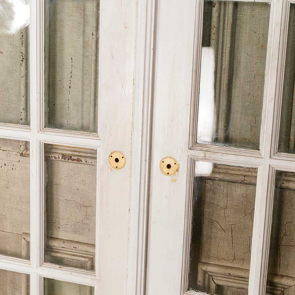 Pair of architectural salvage antique painted wood fifteen lite French doors together measuring approx. 60" wide x 84 1/8" tall x 1 3/8" thick. See photos to evaluate condition. Priced at $1,250 for the pair.