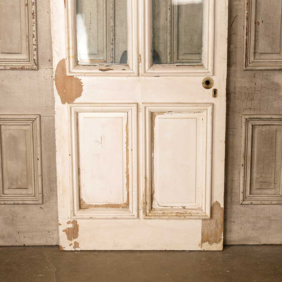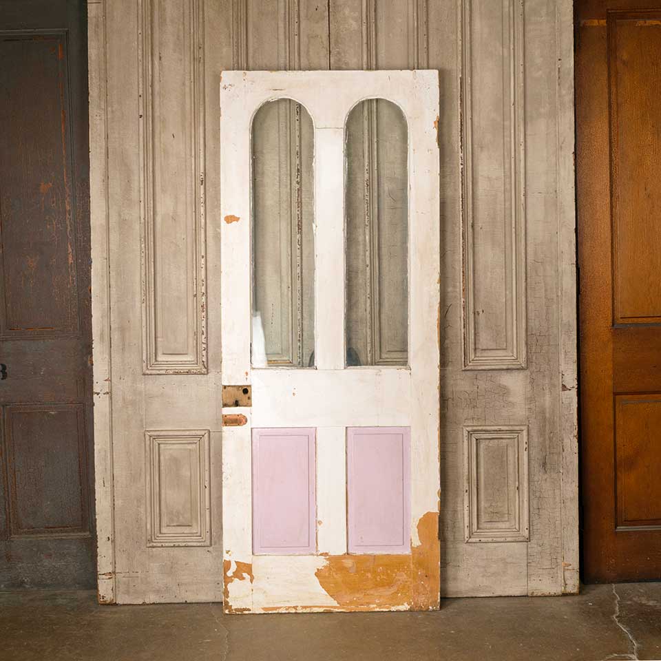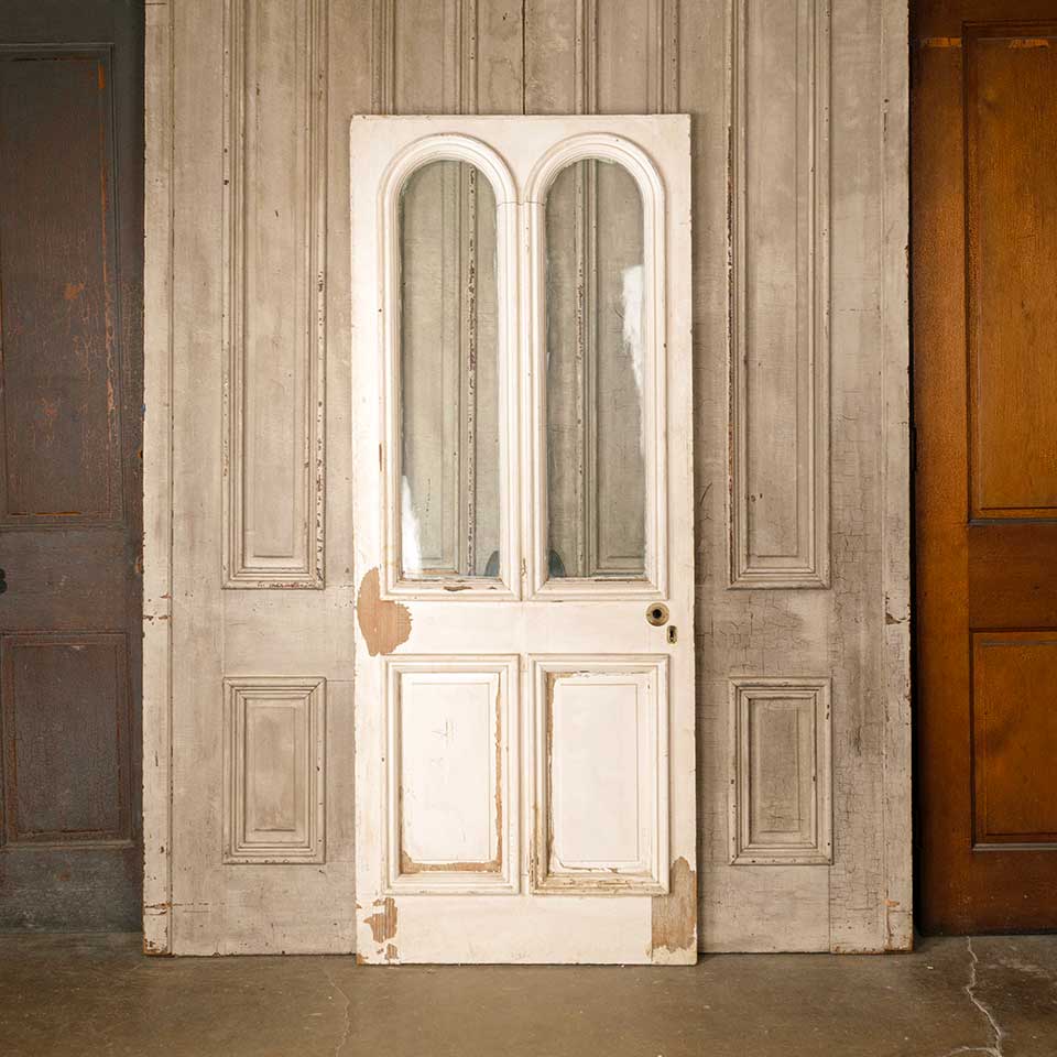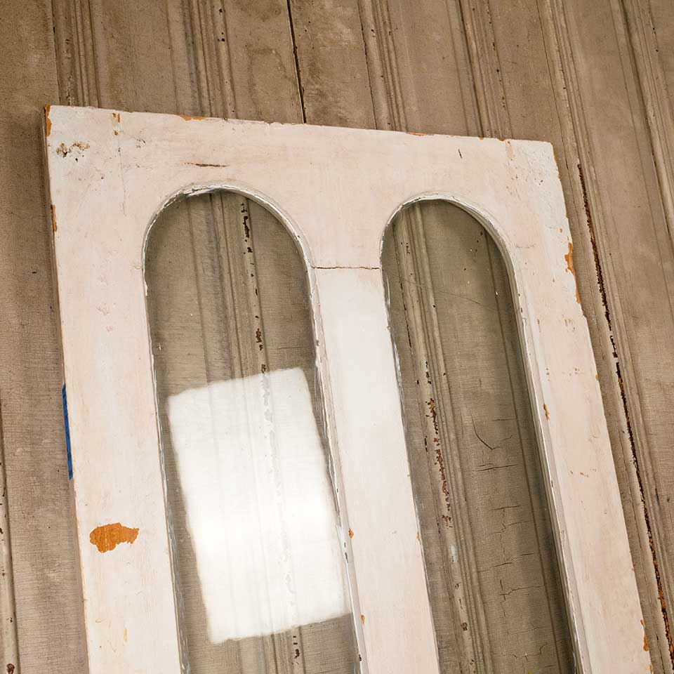 Architectural salvage antique painted wood entry door with two arched top lites with original wavy glass measuring approx. 31 11/16" wide x 79" tall x 1 3/8" thick. One of the panes of glass is cracked. See photos to evaluate condition.