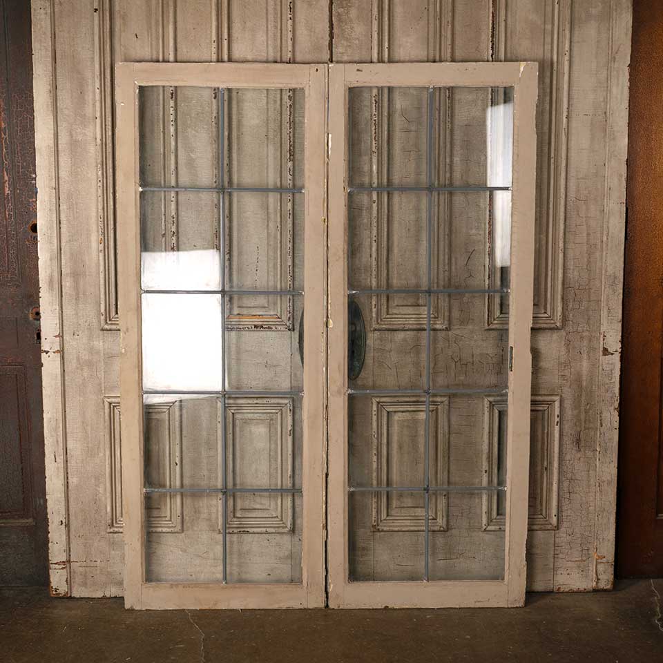 Set of two architectural salvage antique leaded glass casement windows in painted wood sashes together measuring approx. 49 7/8" wide x 66 5/8" tall x 1 3/4" thick. See photos to evaluate condition. Priced at $350 for the two piece set.