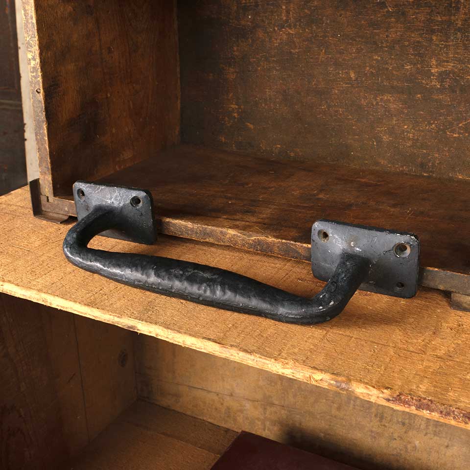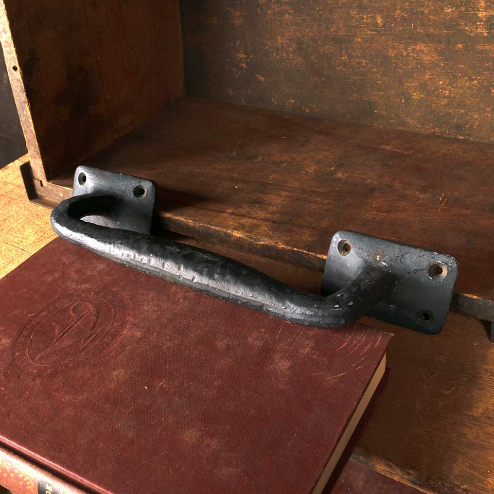 Architectural salvage large cast iron door / furniture pull handle hardware measuring approx. 10 3/8" x 1 3/4" x 2 3/4. Color and condition vary.