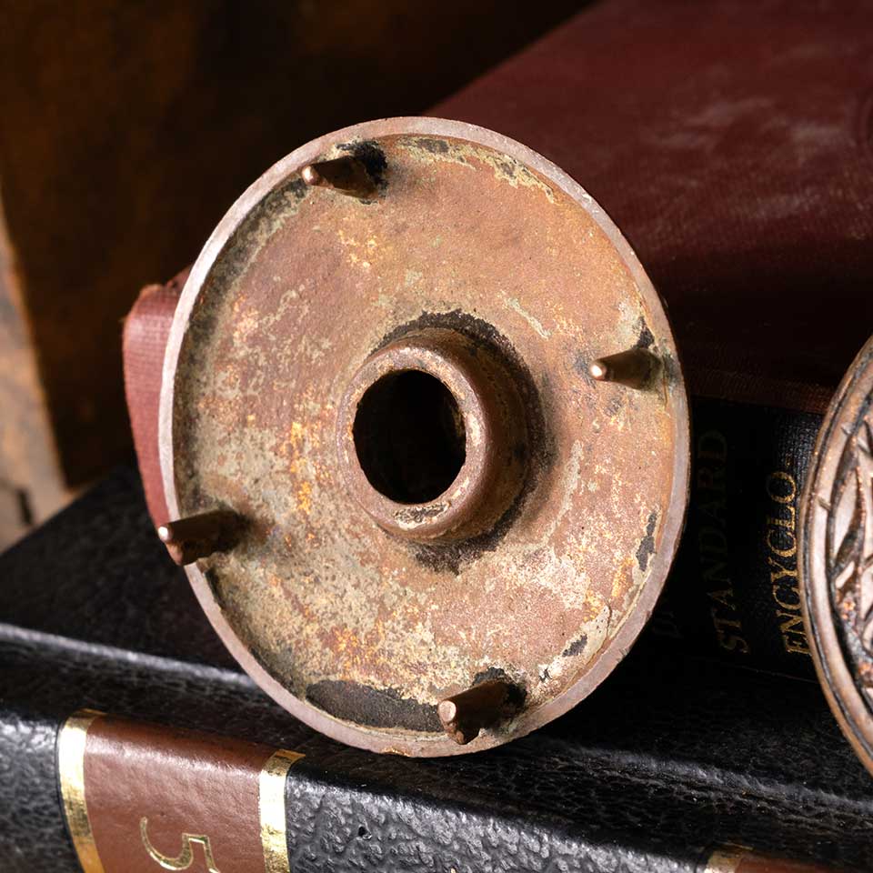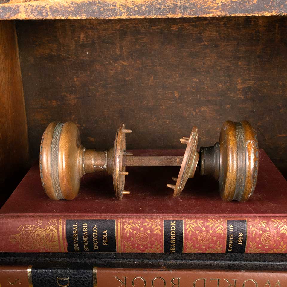 Architectural salvage antique Lock Manufacturing Company Peterborough pattern (circa 1885) ornate Victorian brass door hardware set with Eastlake designs. The set includes two doorknobs (2 1/4" in diameter), two matching doorknob rosette backplates (2 1/8" in diam.), and a tapped spindle with set screws. See photos to evaluate condition. Priced at $275 for the set.
