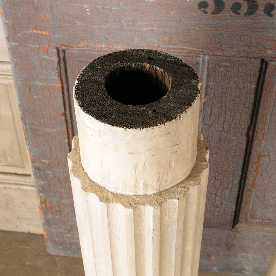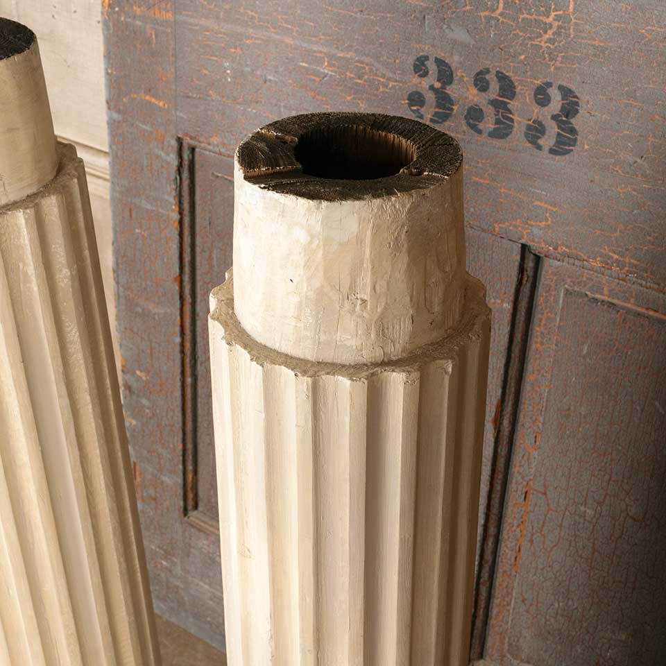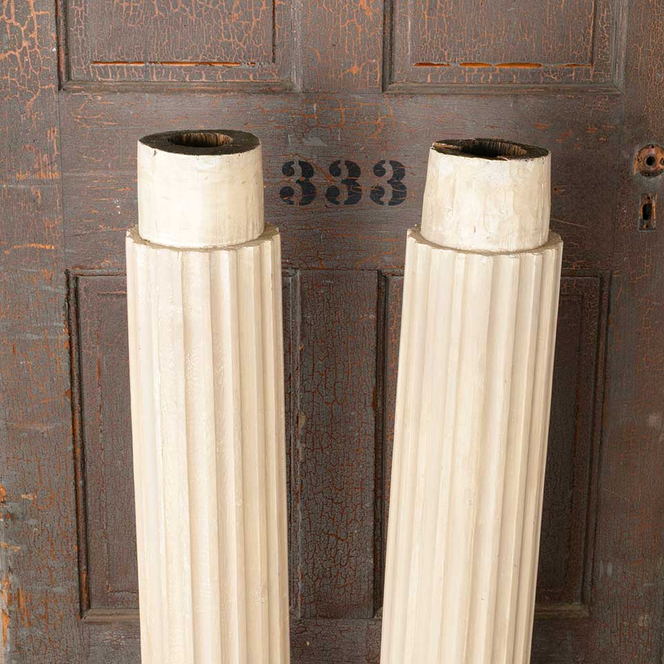 Set of two architectural salvage antique painted wood fluted columns each measuring approx. 40 1/2" tall with a 10" diameter base and a 5 1/4" diameter top. There are no column capital tops with these columns. See photos to evaluate condition. Priced at $175 for the set of two columns.