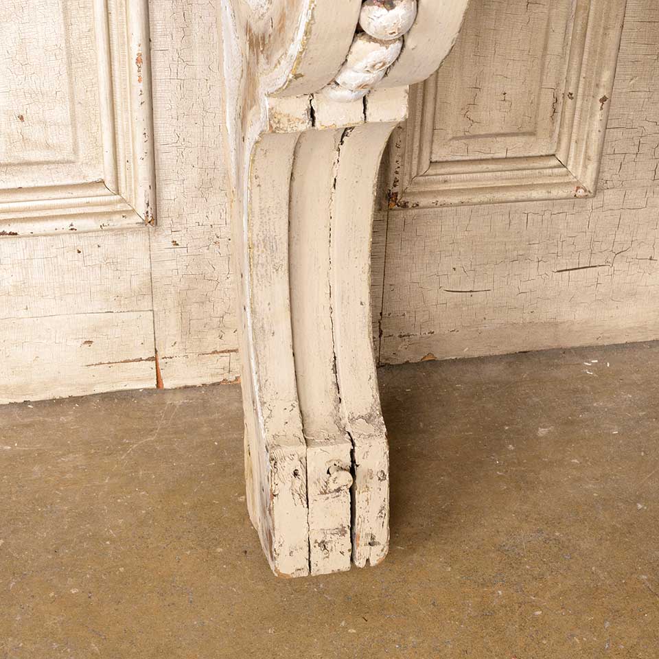 Repurposed architectural salvage antique painted wood house corbel bracket demilune console table measuring approx. 36" wide x 37 3/4" tall x 23" front to back. See photos to evaluate condition.