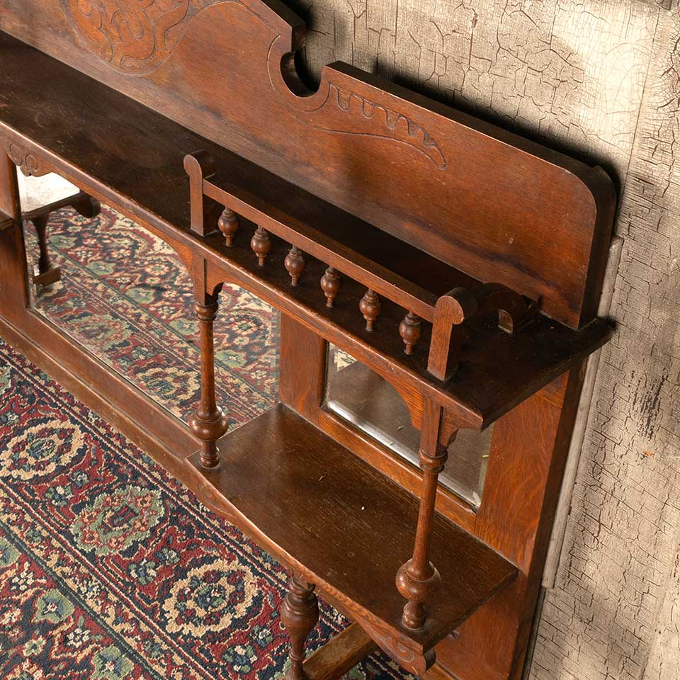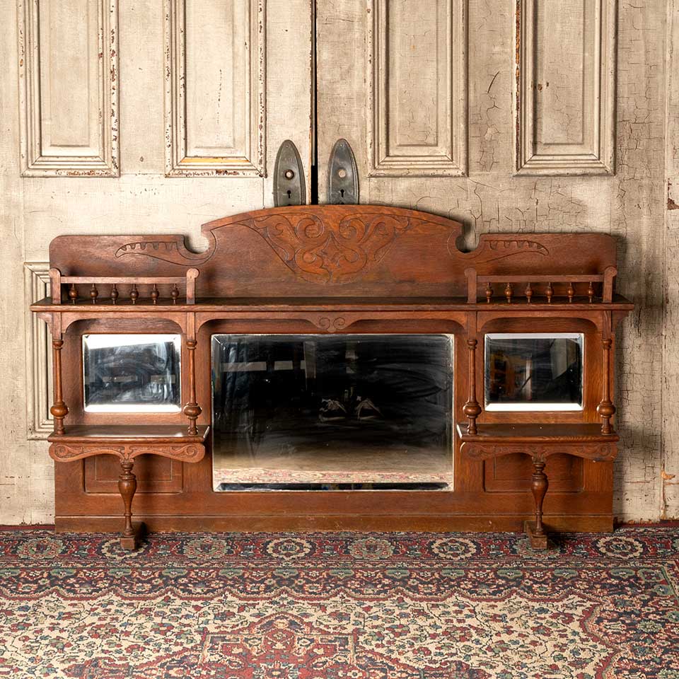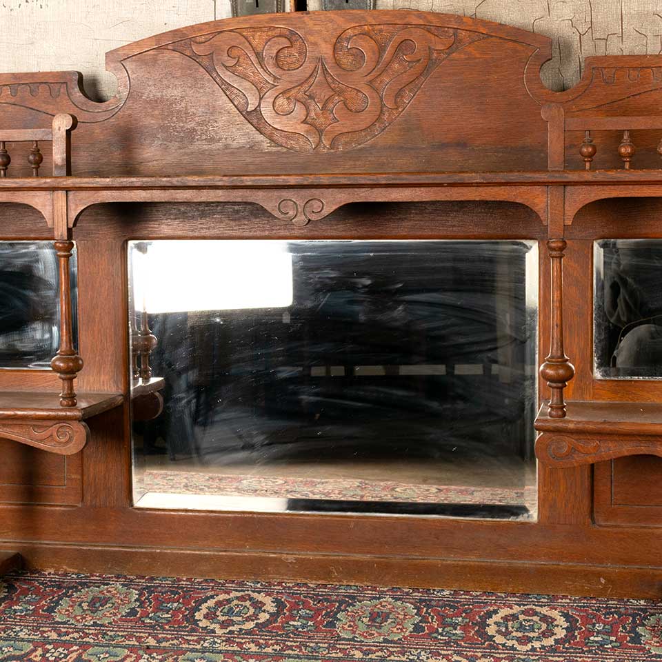 Architectural salvage antique Victorian oak wood overmantel with beveled glass mirrors measuring approx. 56" wide x 32 1/4" tall x 7 1/2" front to back. See photos to evaluate condition.