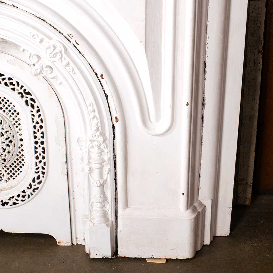 Hard to find 3 piece architectural salvage antique Victorian cast iron fireplace mantel / mantle with arched top surround and removable summer front cover. The mantel measures approximately 63 1/2" wide x 45 5/8" tall x 12 3/4" front to back; the surround measures approx. 32" wide x 32 5/8" tall; and the summer front cover measures approx. 18 5/8 " wide x 26 1/2" tall. See photos to evaluate condition. Priced at $4,500 for the 3 piece set.