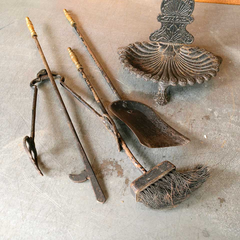 Architectural salvage antique Victorian cast iron fireplace tool set with ornate stand measuring approx. 11 1/4" wide x 24 1/2" tall x 10 1/2" front to back. The set includes an ash shovel, brush (bent), tongs, log poker, and stand. Priced at $225 for the set.