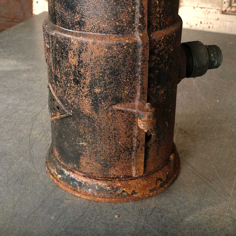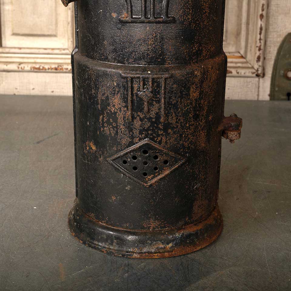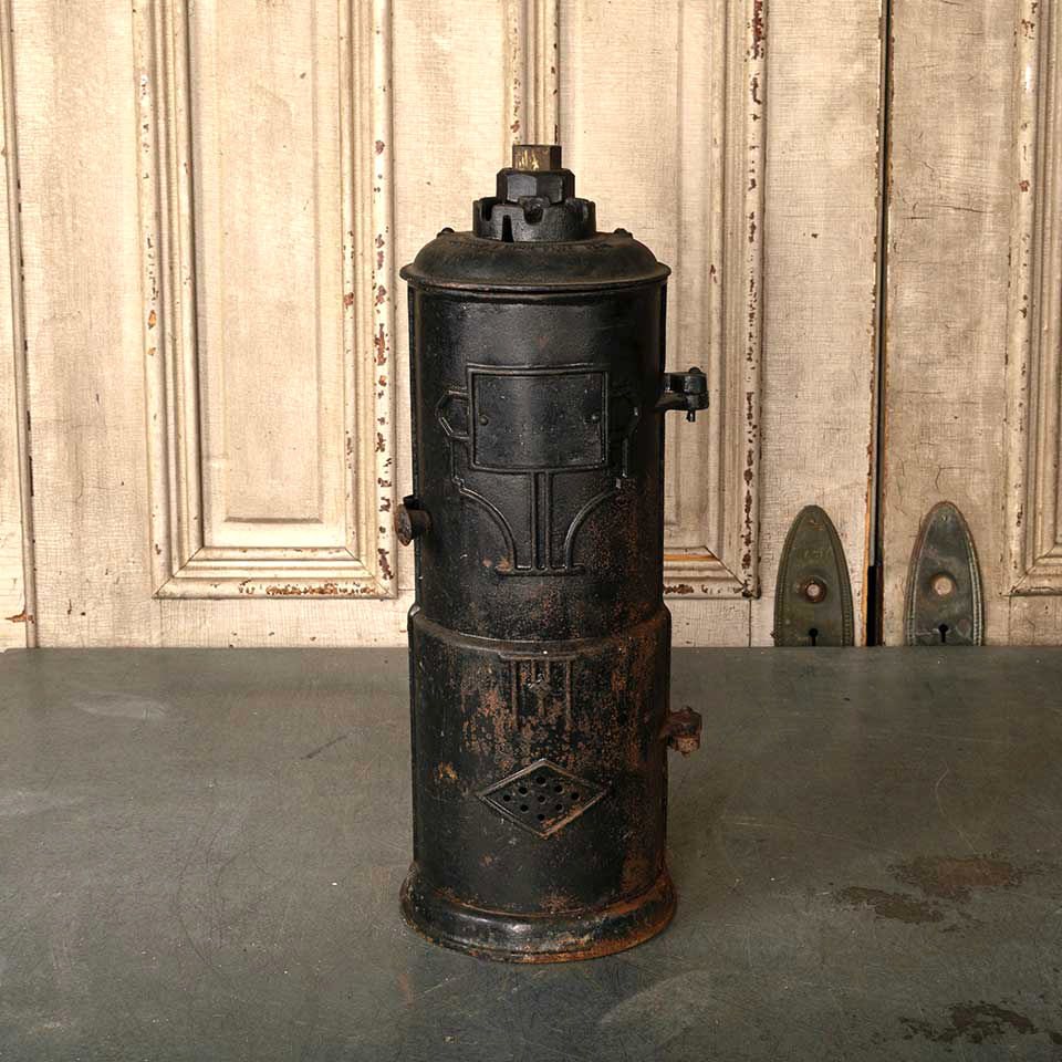 Architectural salvage antique cast iron tankless water heater measuring approx. 20" tall with a 7 1/2" diameter base. See photos to evaluate condition.