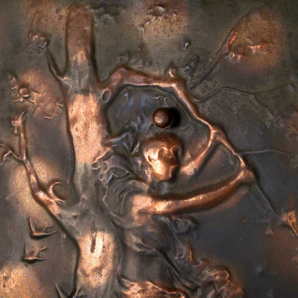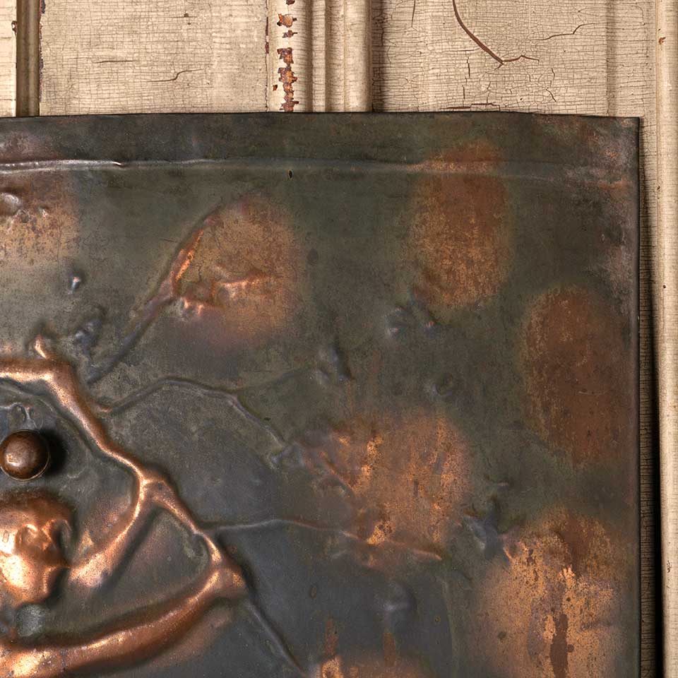 Architectural salvage antique stamped / pressed metal fireplace summer front cover with figural motif measuring approx. 24" wide x 26 1/4" tall x 1" front to back. See photos to evaluate condition.