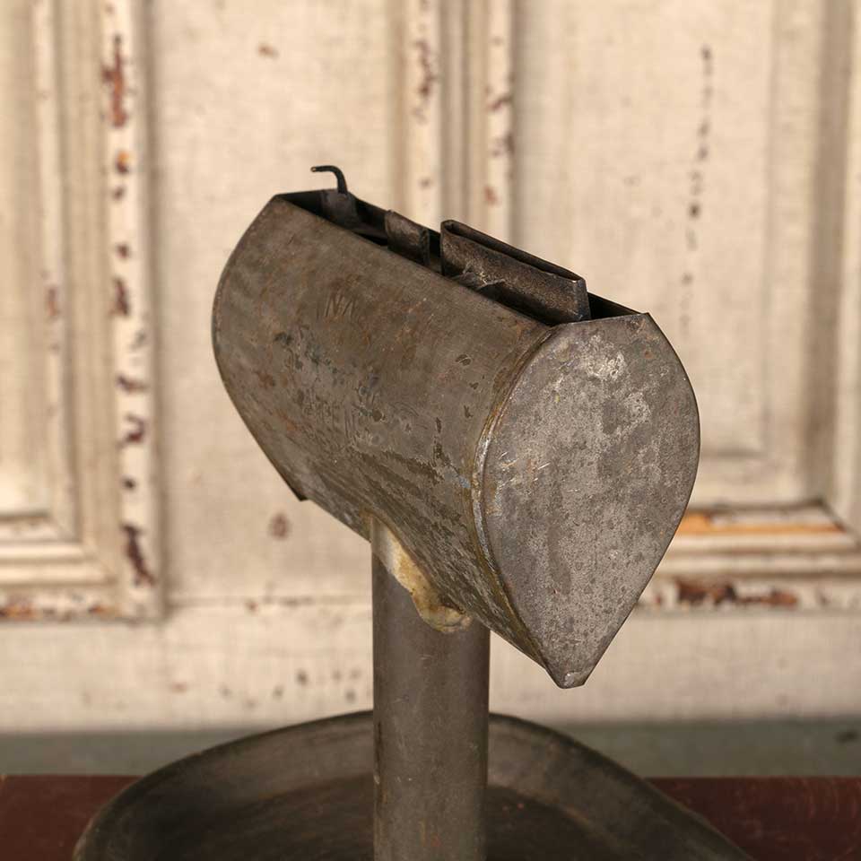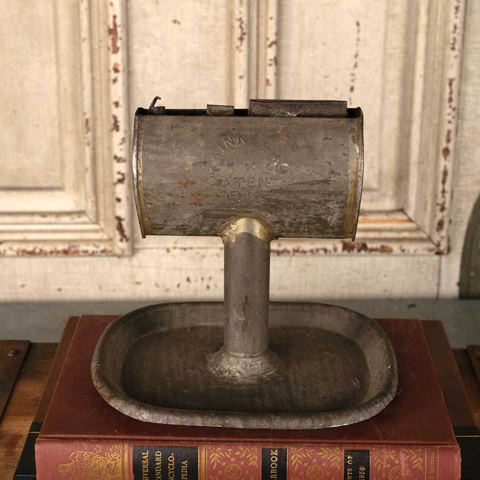 Architectural salvage antique D. Kinnear tin lard lamp with a Patent date of Feb 4 1851 measuring approx. 6 7/8" wide x 6 1/4" tall x 5 1/2" front to back.