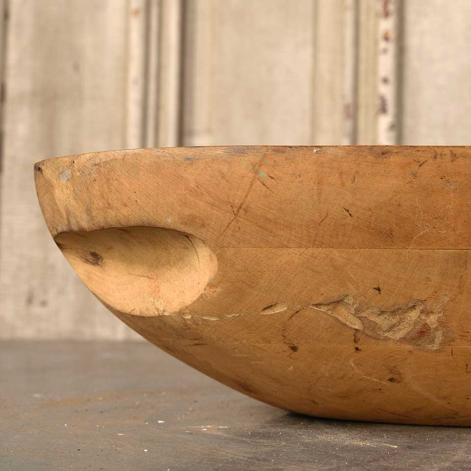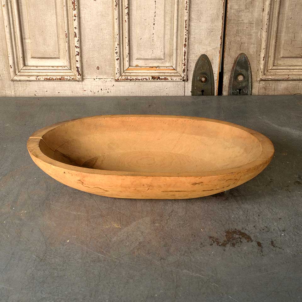 Architectural salvage antique wooden bread dough bowl measuring approx. 20 7/8" wide x 4" tall x 11 1/8" front to back. There is some wood separation in the middle of the bowl, see photos to evaluate.