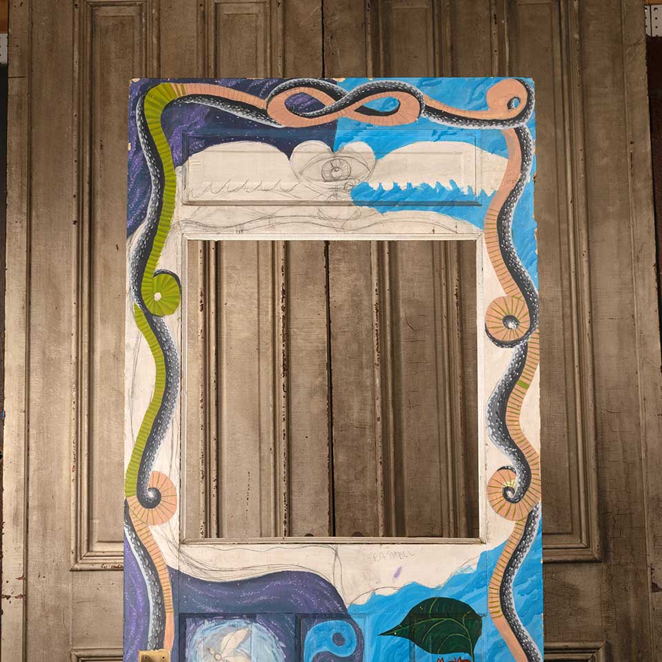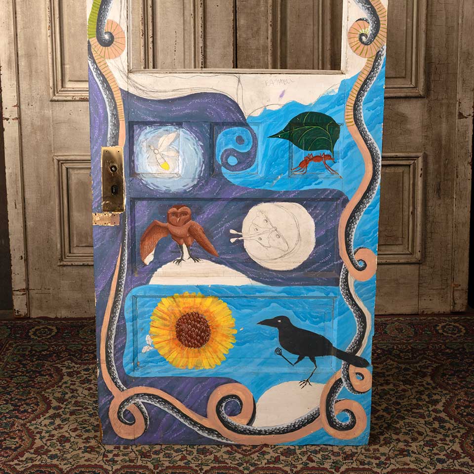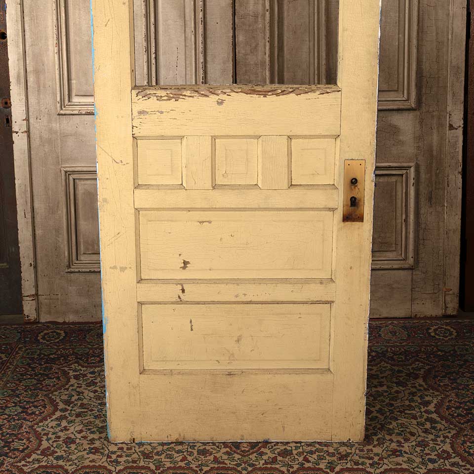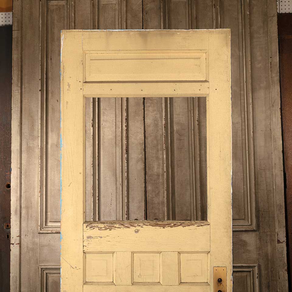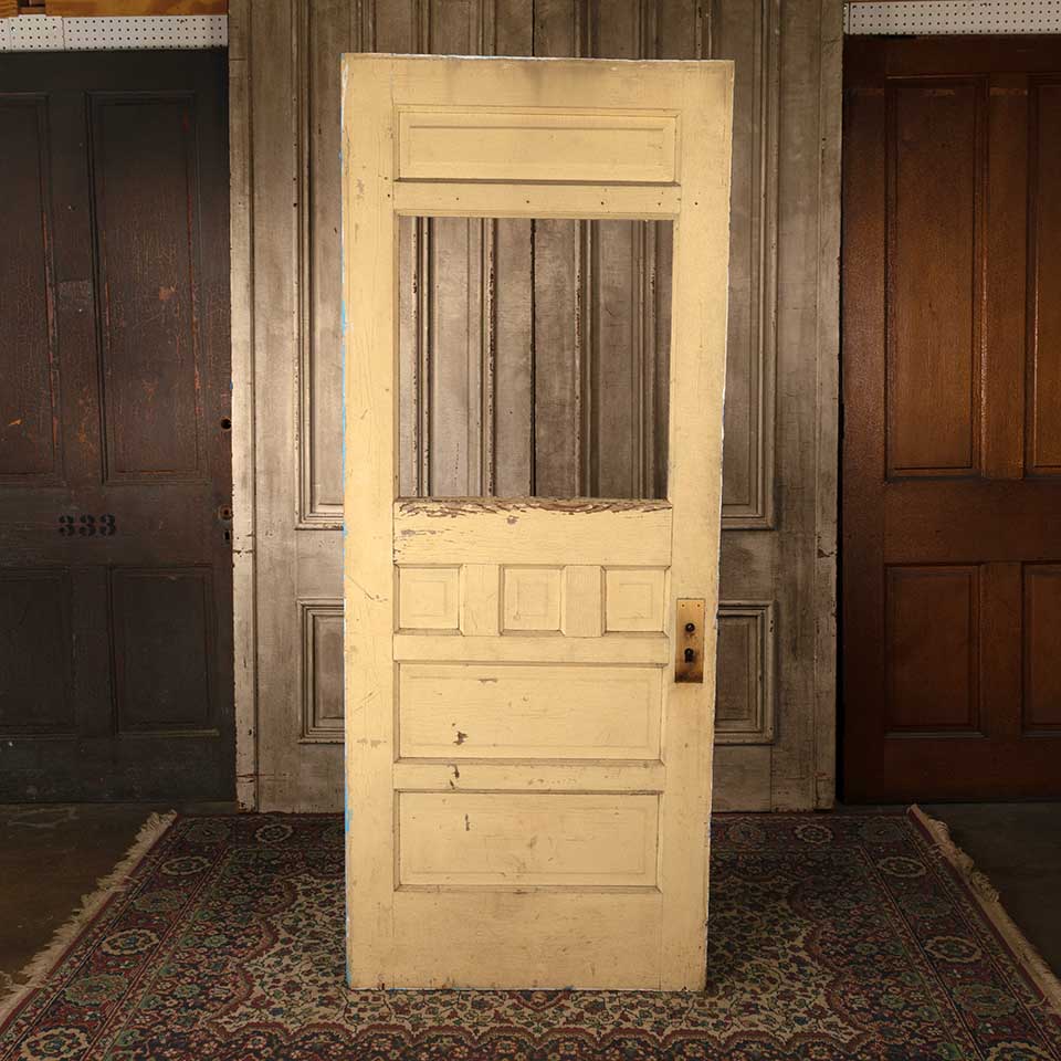 Architectural salvage antique half lite painted wood entry door with artwork on one side measuring approx. 32" wide x 79 3/4" tall x 1 3/8" thick. There's no glass in the opening. See photos to evaluate condition.