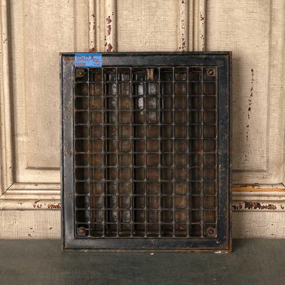 Architectural salvage antique pressed / stamped metal heat grate floor vent cover with operable louvers measuring approx. 10" x 12" (insert dimensions) and 11 15/16" x 14" (overall dimensions). See photos to evaluate condition.