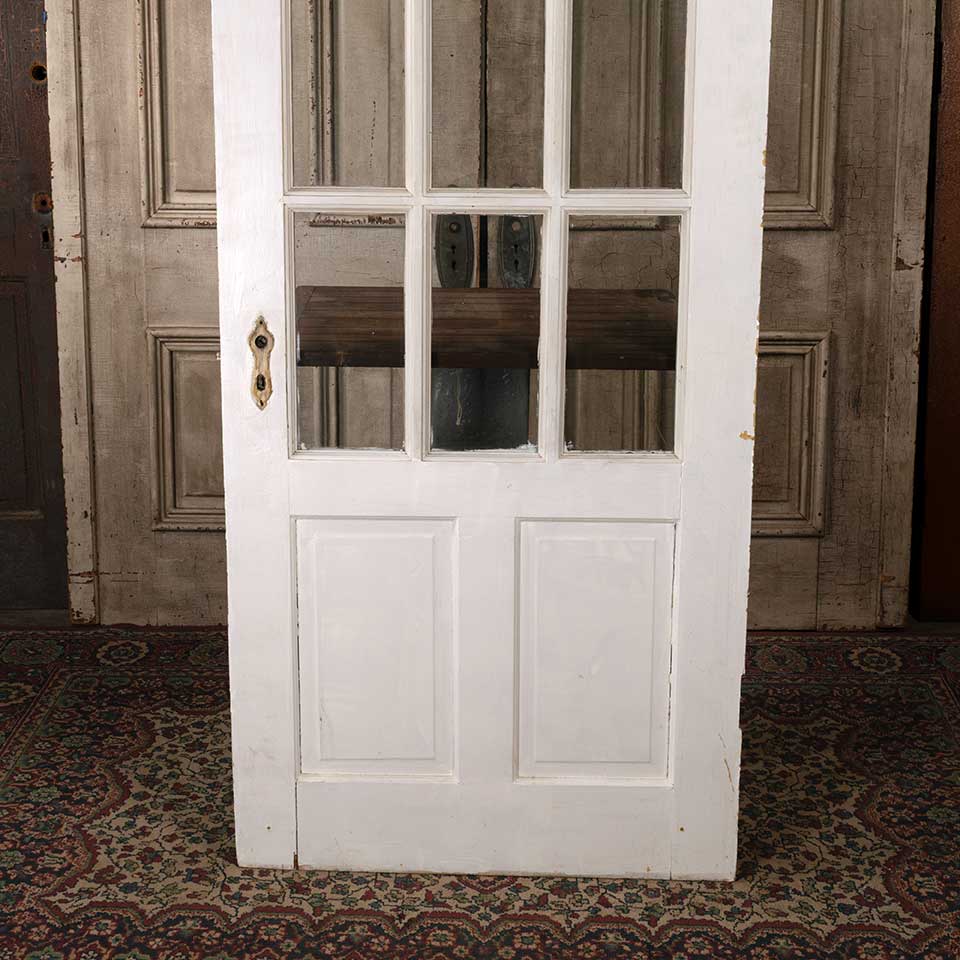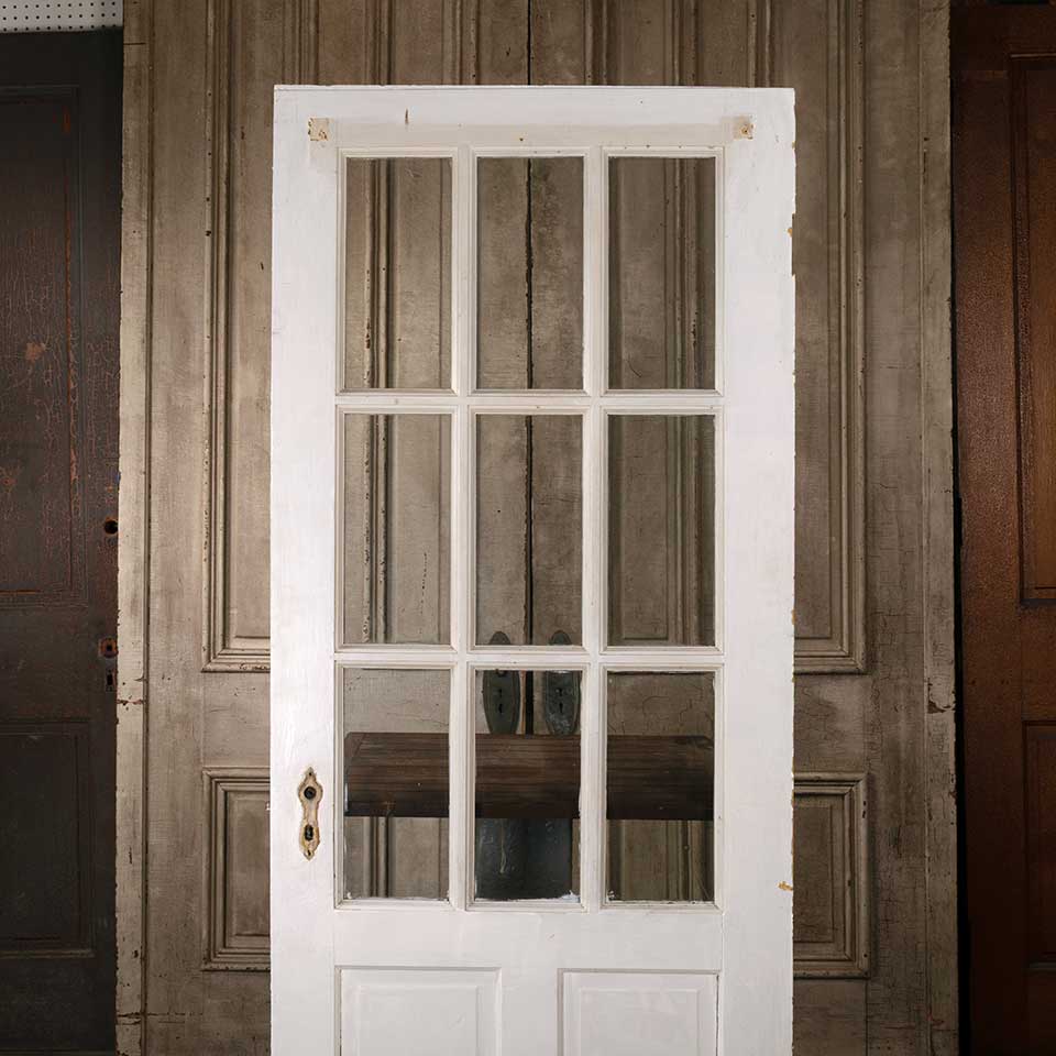 Architectural salvage antique divided nine lite painted wood entry door with mortise lock measuring approx. 31 3/4" wide x 77" tall x 1 3/8" thick. A few of the panes have lines in them that look like cracks but you can only feel them on one side of the glass. A tapered piece of wood has been added to the top of the door. See photos to evaluate condition.