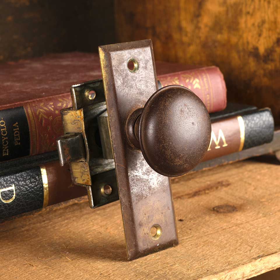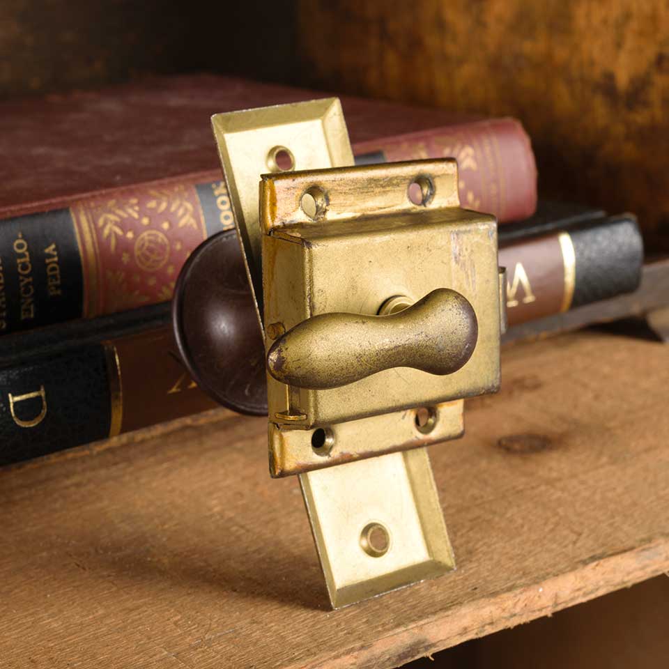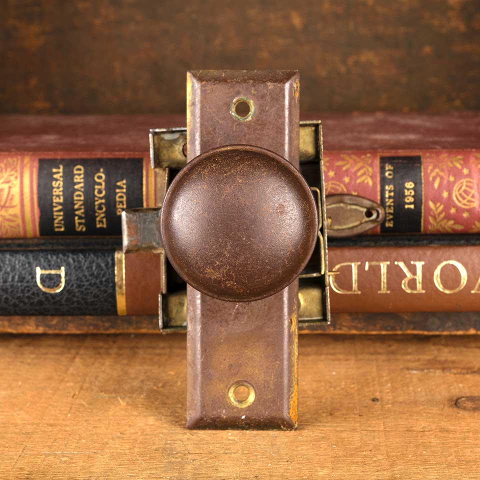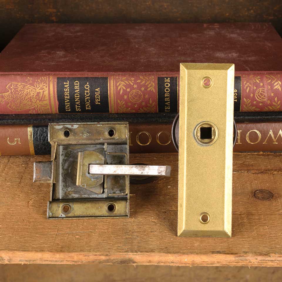 Architectural salvage antique brass screen door hardware set including a 1 1/4" x 4" backplate with a fixed 2 5/8" diameter doorknob and a 2" x 2 3/8" x 1 1/4" surface mount lever latch with an attached 1/4" spindle. See photos to evaluate condition.